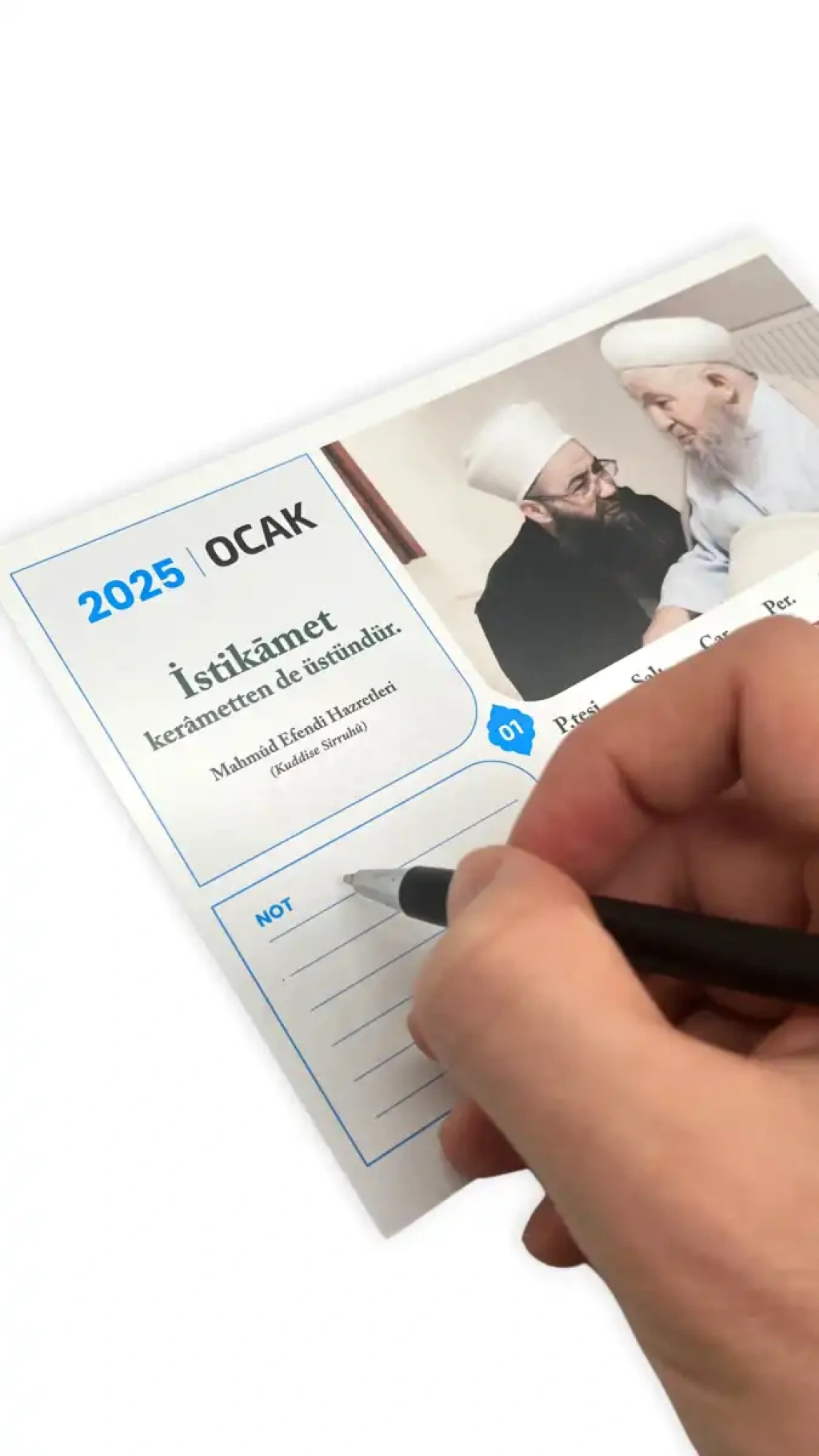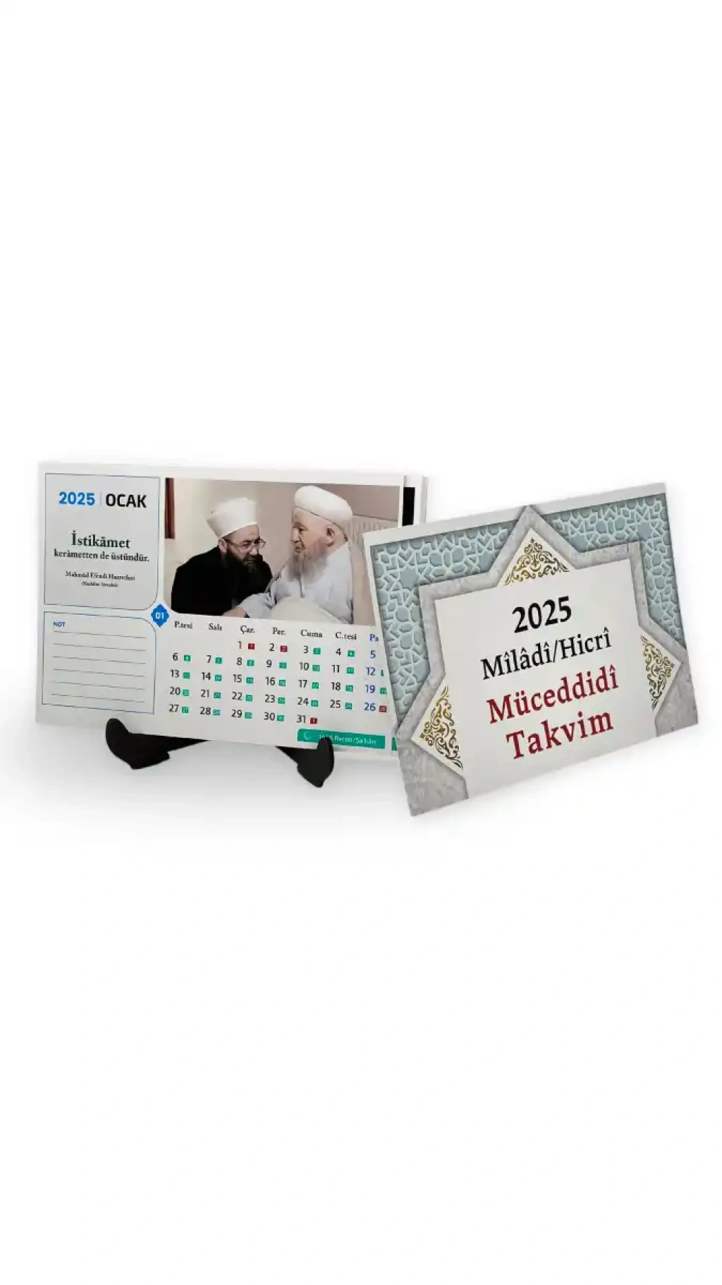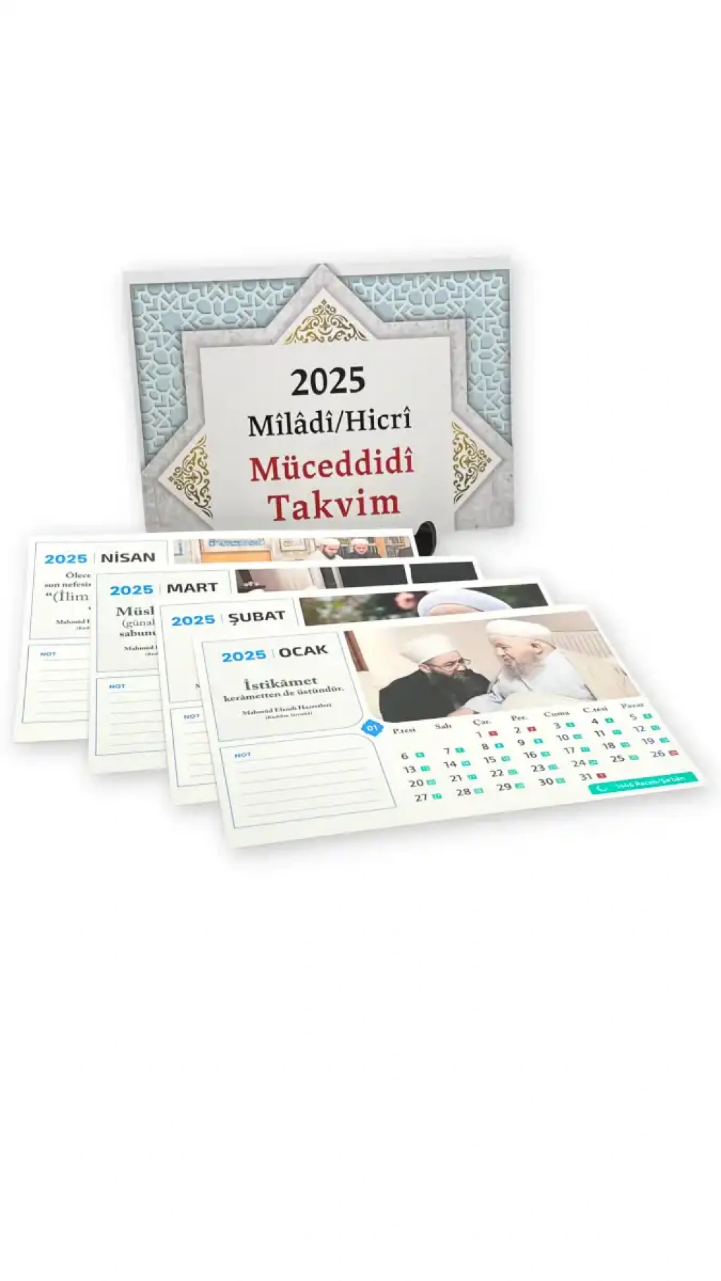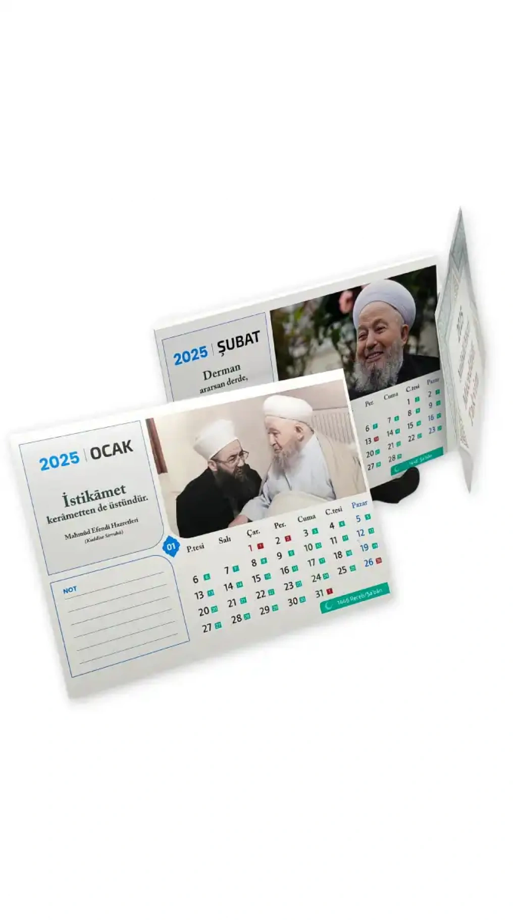 Mahmud Efendi Hazretlerimizin resimleriyle süslenmiş, oldukça şık tasarlanmış olan bu takvimde, Efendi Hazretlerimizden nakşedilen hikmetli sözleri okuyup o  aya ait hicri ve miladi günleri takip edebileceksiniz. İlgili hicri  aya ait bilgiler, ibadetler ve zikirlere ulaşabileceksiniz.