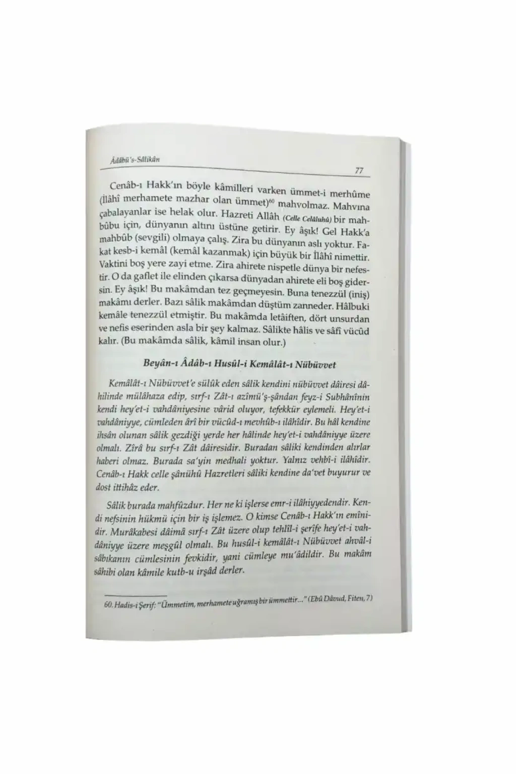“Edep üzere ol ki Cenâb-ı Hakk seni edeplemesin! Zira (Cenâb-ı Hakk), yalancı, variyetli ve iddialıyı sevmez. Sadık ve mahviyetli ve edepliyi sever, muhabbet eder ve pek çok nimetlerini ve Kemâlât-ı Sübhânîyesini öyle olan kimseye ihsân buyurur. Tecelli-i Zâtiyyesi, hâs ve sâdık mahbûbları içindir. Sakın ola ki malına, sıhhatine, haline ve kemâline mağrur olma ki mağrûriyyet seni bir gün berbat etmesin!”