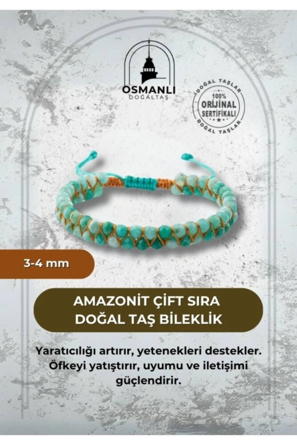 TÜM TAŞLARIMIZ SERTİFİKALI ve %100 ORJİNAL GERÇEK DOĞAL TAŞTIR. Doğal taş takılarının bu eşsiz güzelliği ve faydalarıyla müşterilerimize en kaliteli ve en özel takıları sunuyoruz. Her bir takı, tasarımcılarımız tarafından özenle hazırlanmış, doğal taşların renkleri ve enerjileri ile birlikte, size en uygun olanı seçmenizi sağlar.Doğal taş takılarımız, herhangi bir moda stiline mükemmel bir şekilde uyum sağlar. Aynı zamanda doğanın eşsiz güzelliklerini keşfetmek isteyenler için de harika bir seçenek sunarlar. Kendinizi özel hissetmek istediğinizde, doğal taş takılarımız sizin için mükemmel bir seçenek olacaktır.Ürün İçeriğindeki Taşlar Aşağıda Listelenmiştir. Amazonit Taşı Özellikleri: Kreatif düşünceyi besler. Yetenekleri kuvvetlendirir. Kızgınlık ve öfke gibi keskin negatif duyguları törpüler. Başkalarıyla uyumu artırır.