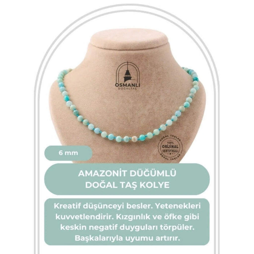 TÜM TAŞLARIMIZ SERTİFİKALI ve %100 ORJİNAL GERÇEK DOĞAL TAŞTIR. Doğal taş takılarının bu eşsiz güzelliği ve dayanıklılığıyla en kaliteli ve en özel takıları sunuyoruz. Her takı, tasarımcılarımız tarafından tasarlanmış, doğal taşların renkleri ve enerjileri ile birlikte, boyut ve uygun olanı seçmenizi sağlar. Doğal taş takılarımız, herhangi bir moda stiline mükemmel bir şekilde uyum sağlar. Aynı zamanda doğal güzelliklerini ayırmak isteyenler için harika bir seçenek sunuyorlar. Kendinizi özel hissetmek istediğinizde, doğal taş takılarımız sizin için mükemmel bir seçenek olacaktır. Ürün İçeriğindeki Taşlar Aşağıda Listelenmiştir. Amazonit Taşı Özellikleri: özgün düşünceyi besler. Yetenekleri güçlendirir. Kızgınlık ve öfke gibi keskin negatif sıcaklıkta törpüler. Başkalarıyla birlikte artar.