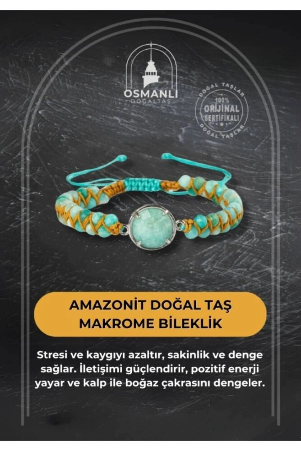 TÜM TAŞLARIMIZ SERTİFİKALI ve %100 ORJİNAL GERÇEK DOĞAL TAŞTIR. Doğal taş takılarının bu eşsiz güzelliği ve faydalarıyla müşterilerimize en kaliteli ve en özel takıları sunuyoruz. Her bir takı, tasarımcılarımız tarafından özenle hazırlanmış, doğal taşların renkleri ve enerjileri ile birlikte, size en uygun olanı seçmenizi sağlar.Doğal taş takılarımız, herhangi bir moda stiline mükemmel bir şekilde uyum sağlar. Aynı zamanda doğanın eşsiz güzelliklerini keşfetmek isteyenler için de harika bir seçenek sunarlar. Kendinizi özel hissetmek istediğinizde, doğal taş takılarımız sizin için mükemmel bir seçenek olacaktır.Ürün İçeriğindeki Taşlar Aşağıda Listelenmiştir.  Amazonit Taşı Özellikleri: Kreatif düşünceyi besler. Yetenekleri kuvvetlendirir. Kızgınlık ve öfke gibi keskin negatif duyguları törpüler. Başkalarıyla uyumu artırır.BİLGİ:Doğal taşların faydaları günümüzde birçok kullanıcıdan alınan geri dönüşlerde defeatle gözlemlenmiştir. Kan dolaşımına ve sindirim sistemine bir ilaç gibi dahil edilememesi; enerjileri ve kullanımı açısından sunacağı faydaya inanma ön koşulu gerektirmesiyle kesinlikle bir ilaç mahiyetinde değildir. Fakat geçmişten günümüze Biruni ve İbn-i Sina gibi büyük tıp alimleri doğal taşlar üzerinde düşünmüş, araştırmış ve geliştirdikleri tedavi yöntemlerine dahil etmişlerdir.Doğal taşların faydaları bilimsel bir deney-gözlem sürecinden ziyade geçmişte yaşayan toplumların ve tıp alimlerinin kullanım amaçlarına istinaden belirlenmekte, tespit edilmektedir. Bil biliyoruz ki şifa sadece Allah’tandır. Nereden ve nasıl geleceği belli olmaz. KAYNAK:Osmanlı Doğaltaş taşların özellikleri ve kullanım bilgileri için aşağıdaki kaynaklardan faydalanmaktadır.Walter Schumann, Gemstones Of The World (Sterling Yayın Evi, 17. Baskı).Judy Hall, Değerli Taşlar Kitabı (Alfa Basım Yayın, 3. Basım, 2021)Muhammed Bin Mahmud-ı Şirvani, Tuhfe-i Muradi. Hazırlayan: Mustafa Argunşah (Türk Dil Kurumu, 1999)Patrick Voillot, Elmaslar ve Değerli Taşlar (Yapı Kredi Yayınları, 1. Baskı, 2013)