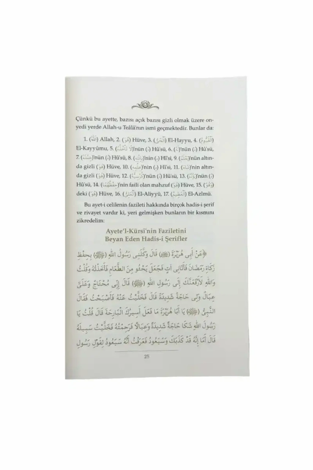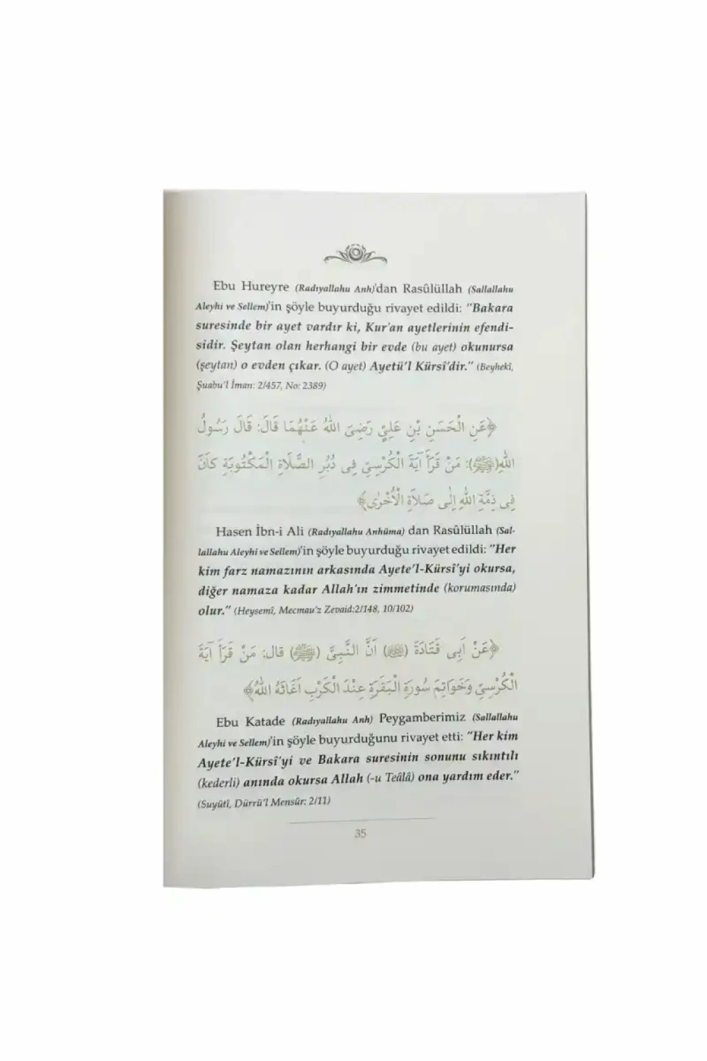 ‘Yâ Rasûlellâh! Kur’ân’ın hangi sûresi (derece bakımından) daha büyüktür?’ dedi. Peygamber (Sallâllâhu Aleyhi ve Sellem) de: ‘İhlâs Sûresi’ diye cevap verdi. Bunun üzerine (o kişi): ‘Kur’ân’daki hangi âyet (fazilet bakımından) daha üstündür?’ deyince, Efendimiz (Sallâllâhu Aleyhi ve Sellem): ‘Âyete’l-Kürsî’dir.’ buyurdu.