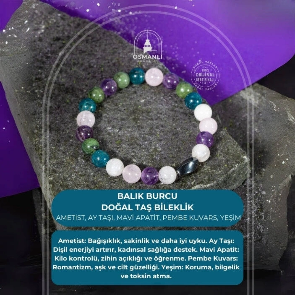 TÜM TAŞLARIMIZ SERTİFİKALI ve %100 ORJİNAL GERÇEK DOĞAL TAŞTIR. Doğal taş takılarının bu eşsiz güzelliği ve faydalarıyla müşterilerimize en kaliteli ve en özel takıları sunuyoruz. Her bir takı, tasarımcılarımız tarafından özenle hazırlanmış, doğal taşların renkleri ve enerjileri ile birlikte, size en uygun olanı seçmenizi sağlar. Doğal taş takılarımız, herhangi bir moda stiline mükemmel bir şekilde uyum sağlar. Aynı zamanda doğanın eşsiz güzelliklerini keşfetmek isteyenler için de harika bir seçenek sunarlar. Kendinizi özel hissetmek istediğinizde, doğal taş takılarımız sizin için mükemmel bir seçenek olacaktır. Ürün İçeriğindeki Taşlar Aşağıda Listelenmiştir. Ametist Taşı Özellikleri: Bağışıklığı yükseltir, sakinleştirici ve rahatlatıcıdır, uyku problemlerine giderir ve yoğun duygu ataklarını önler. Ay Taşı Özellikleri: Her kadında olması gereken başlıca taştır. Kadın taşıdır. Kadınsal rahatsızlıklara iyi gelir. Kadınsal, dişil enerjiyi ve hormonları artırır, teşvik eder. Mavi Apatit Taşı Özellikleri: Açlık hissini bastırarak kilo vermeyi destekler ve artırır, Zihin açıklığı verir, öğrenmeyi ve idrak etmeyi yükseltir. Pembe Kuvars Taşı Özellikleri: Her kadında olmazsa olmaz olan taşlardandır. Romantizmi kuvvetlendirir. Çiftler arasında aşkı ve tutkuyu artırır. Cilde parlaklık verir, güzelleştirir. Yeşim Taşı Özellikleri: Nazarı önler ve varsa giderir. Bilge bakış açısı kazandırır. Kendi kendine yeterli olmayı sağlar. Fikir üretmeyi destekler. Öz benliği açığa çıkarır. Toksinleri giderir.