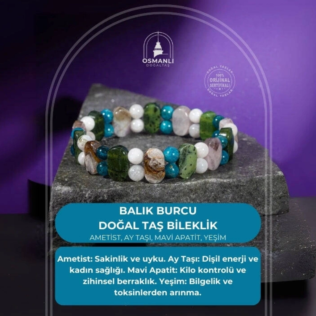 TÜM TAŞLARIMIZ SERTİFİKALI ve %100 ORJİNAL GERÇEK DOĞAL TAŞTIR. Doğal taş takılarının bu eşsiz güzelliği ve faydalarıyla müşterilerimize en kaliteli ve en özel takıları sunuyoruz. Her bir takı, tasarımcılarımız tarafından özenle hazırlanmış, doğal taşların renkleri ve enerjileri ile birlikte, size en uygun olanı seçmenizi sağlar. Doğal taş takılarımız, herhangi bir moda stiline mükemmel bir şekilde uyum sağlar. Aynı zamanda doğanın eşsiz güzelliklerini keşfetmek isteyenler için de harika bir seçenek sunarlar. Kendinizi özel hissetmek istediğinizde, doğal taş takılarımız sizin için mükemmel bir seçenek olacaktır. Ürün İçeriğindeki Taşlar Aşağıda Listelenmiştir. Ametist Taşı Özellikleri: Bağışıklığı yükseltir, sakinleştirici ve rahatlatıcıdır, uyku problemlerine giderir ve yoğun duygu ataklarını önler. Ay Taşı Özellikleri: Her kadında olması gereken başlıca taştır. Kadın taşıdır. Kadınsal rahatsızlıklara iyi gelir. Kadınsal, dişil enerjiyi ve hormonları artırır, teşvik eder. Mavi Apatit Taşı Özellikleri: Açlık hissini bastırarak kilo vermeyi destekler ve artırır, Zihin açıklığı verir, öğrenmeyi ve idrak etmeyi yükseltir. Yeşim Taşı Özellikleri: Nazarı önler ve varsa giderir. Bilge bakış açısı kazandırır. Kendi kendine yeterli olmayı sağlar. Fikir üretmeyi destekler. Öz benliği açığa çıkarır. Toksinleri giderir.