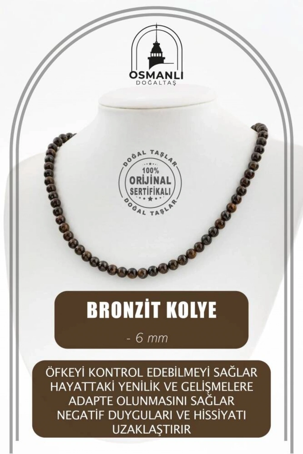 TÜM TAŞLARIMIZ SERTİFİKALI ve %100 ORJİNAL GERÇEK DOĞAL TAŞTIR. Doğal taş takılarının bu eşsiz güzelliği ve dayanıklılığıyla en kaliteli ve en özel takıları sunuyoruz. Her takı, tasarımcılarımız tarafından tasarlanmış, doğal taşların renkleri ve enerjileri ile birlikte, boyut ve uygun olanı seçmenizi sağlar. Doğal taş takılarımız, herhangi bir moda stiline mükemmel bir şekilde uyum sağlar. Aynı zamanda doğal güzelliklerini ayırmak isteyenler için harika bir seçenek sunuyorlar. Kendinizi özel hissetmek istediğinizde, doğal taş takılarımız sizin için mükemmel bir seçenek olacaktır. Ürün İçeriğindeki Taşlar Aşağıda Listelenmiştir. Bronzit Taşı Özellikleri: Temel çakra taşıdır. Öfkeyi kontrol edebilmeyi sağlar. Hayattaki yenilik ve gelişmelere uyum sağlanmasını sağlar. Negatif sözcükler ve hisyatını uzaklaştırır.