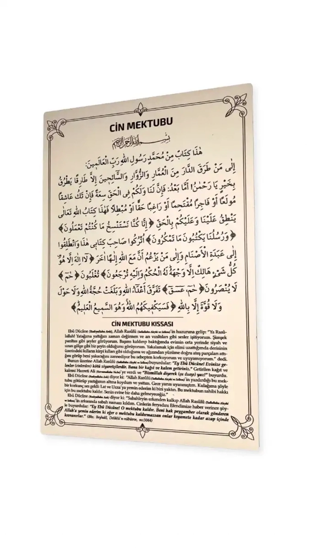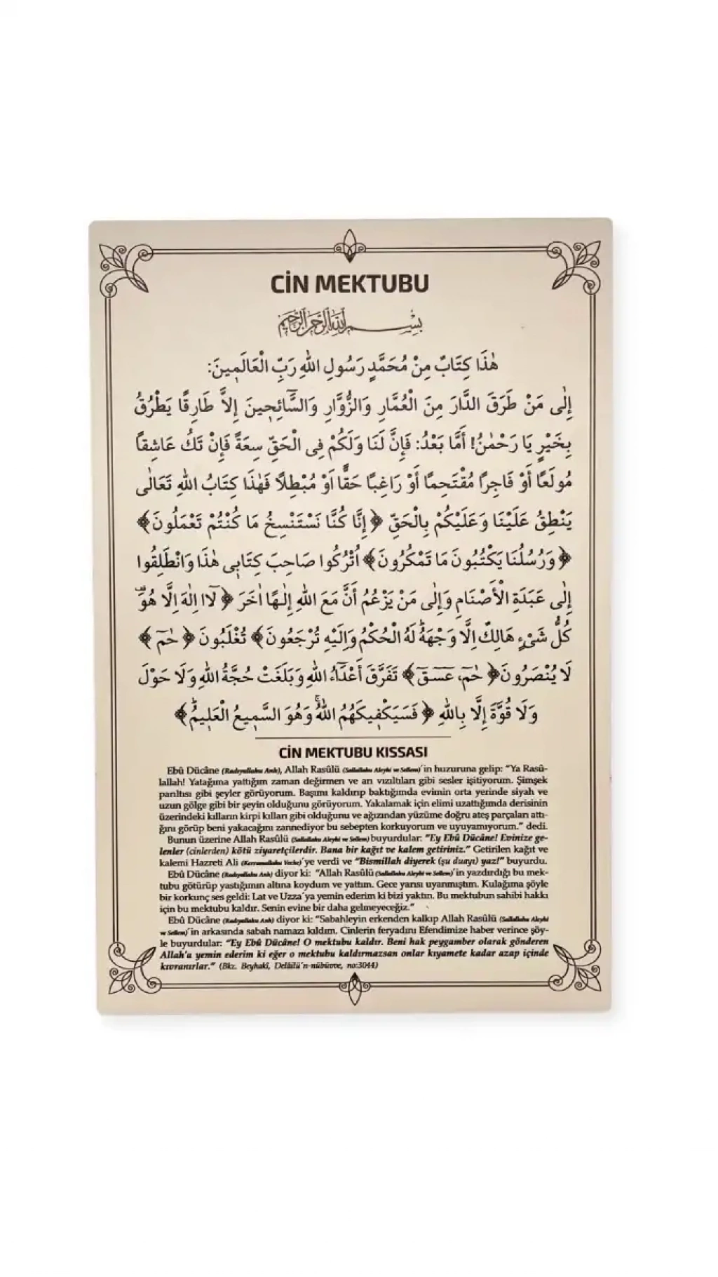 "Ey Ebu Dücane, evinize gelen korkunç bir mahluktur. Bana bir kağıt ve kalem getiriniz." Getirilen kağıt ve kalemi Hazreti Ali (k.v.)´ye verdi ve "Bismillah diyerek (yukarda ki duayı) yaz." buyurdu. Ebu Dücane (r.a.) diyor ki: "Resulü Ekrem (s.a.v.)´in yazdırdığı bu mektubu götürüp yastığımın altına koydum ve yattım. Gece yarısı uyanmıştım. Kulağıma şöyle bir korkunç ses geldi: Lat ve Uzza´ya yemin ederim ki bizi yaktın. Bu mektubun sahibi hakkı için bu mektubu kaldır. Senin evine bir daha gelmeyeceğiz." Ebu Dücane (r.a.) diyor ki: "Sabahleyin erkenden kalkıp Resulü Ekrem (s.a.v.)´in arkasında sabah namazı kıldım. Cinlerin feryadını Resulü Ekrem (s.a.v.)´e haber verdim." Resulü Ekrem (s.a.v.) bana şöyle buyurdu: "Ey Ebu Dücane! O mektubu kaldır. Beni hak peygamber olarak gönderen Allah'a yemin ederim ki eğer o mektubu kaldırmazsan, onlar kıyamete kadar azap içinde kıvranırlar."