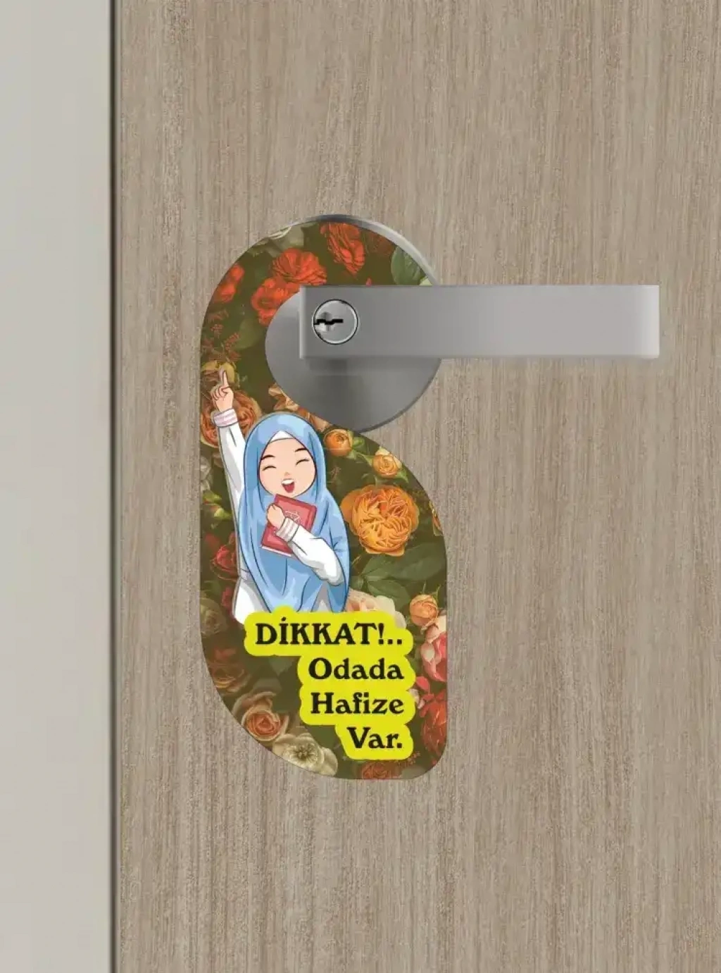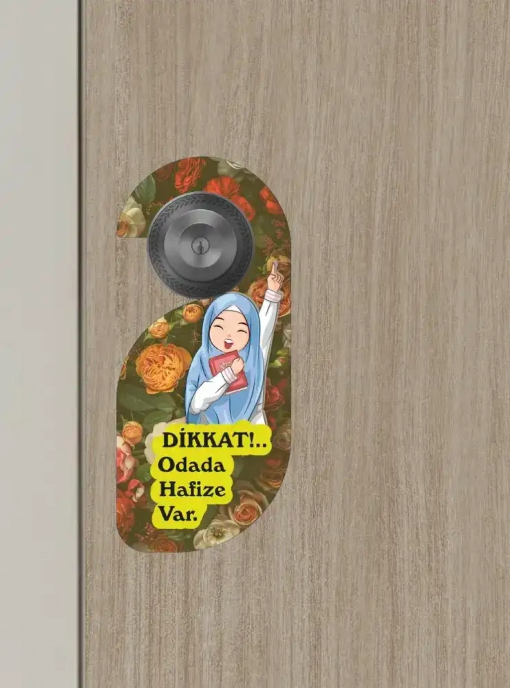 Şık çiçek desenli arka planı ve sevimli hafize çizimiyle hem dekoratif hem de işlevsel bir ürün. Odaya girmeden önce saygıyı hatırlatır, ders ortamının huzurunu korur.