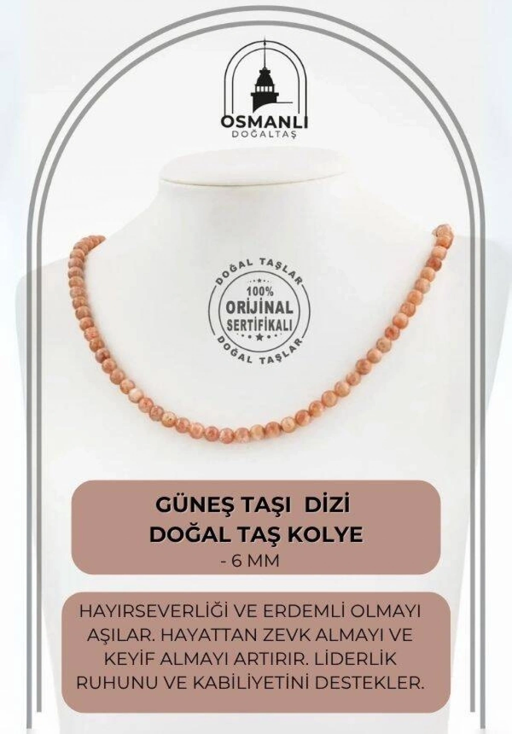 TÜM TAŞLARIMIZ SERTİFİKALI ve %100 ORJİNAL GERÇEK DOĞAL TAŞTIR. Doğal taş takılarının bu eşsiz güzelliği ve dayanıklılığıyla en kaliteli ve en özel takıları sunuyoruz. Her takı, tasarımcılarımız tarafından tasarlanmış, doğal taşların renkleri ve enerjileri ile birlikte, boyut ve uygun olanı seçmenizi sağlar. Doğal taş takılarımız, herhangi bir moda stiline mükemmel bir şekilde uyum sağlar. Aynı zamanda doğal güzelliklerini ayırmak isteyenler için harika bir seçenek sunuyorlar. Kendinizi özel hissetmek istediğinizde, doğal taş takılarımız sizin için mükemmel bir seçenek olacaktır. Ürün İçeriğindeki Taşlar Aşağıda Listelenmiştir. Güneş Taşı Özellikleri: Hayırseverliği ve erdemli olmayı aşılar. Hayattan zevk almayı ve keyif almayı arttırır. Liderlik kapasitesi ve kapasitesini ifade eder.