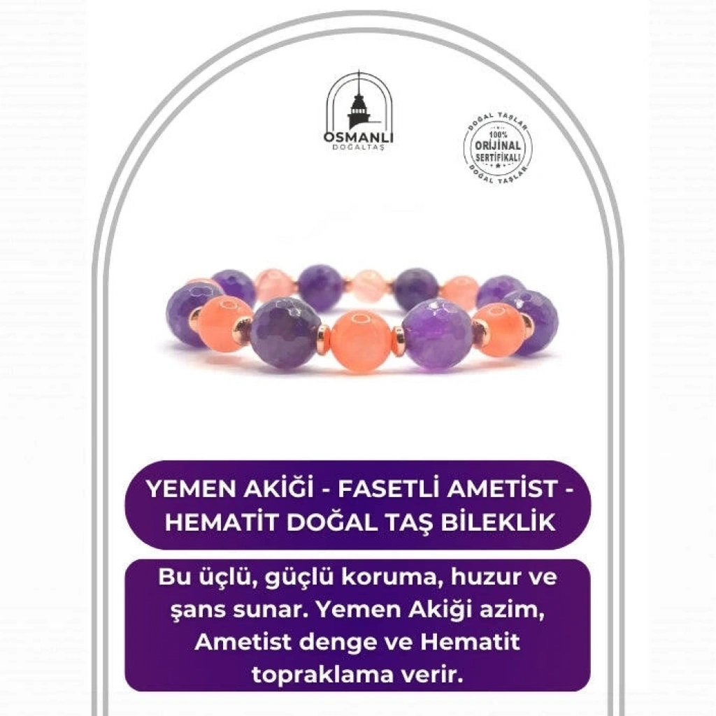 10mm Ametist - 8mm Yemen Akiği - küçük Hematit Aparatlı Misinalı Bileklik Yemen Akik Taşı Özellikleri: Sosyalleştirir. Yaratıcılığı, aklı ve mantığı besler. Cesareti artırır, korkuların yenilmesine yardımcı olur. Odaklanmayı artırır. Pozitif enerji verir: Rahatlatır. Stresi Giderir. Ametist Taşı Özellikleri: Bağışıklığı yükseltir, sakinleştirici ve rahatlatıcıdır, uyku problemlerine giderir ve yoğun duygu ataklarını önler. Hematit Taşı Özellikleri: Hayatta kalma iç güdüsünü artırır. Cesaret, irade ve özgüven duygularını artırır. Cesaret, irade ve özgüven duygularını yükseltir.