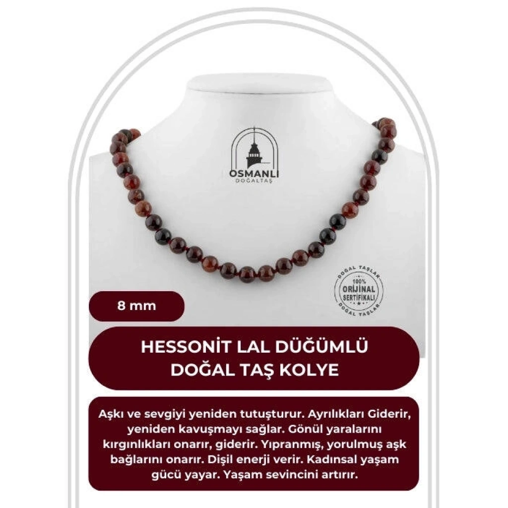 TÜM TAŞLARIMIZ SERTİFİKALI ve %100 ORJİNAL GERÇEK DOĞAL TAŞTIR. Doğal taş takılarının bu eşsiz güzelliği ve faydalarıyla müşterilerimize en kaliteli ve en özel takıları sunuyoruz. Her bir takı, tasarımcılarımız tarafından özenle hazırlanmış, doğal taşların renkleri ve enerjileri ile birlikte, size en uygun olanı seçmenizi sağlar. Doğal taş takılarımız, herhangi bir moda stiline mükemmel bir şekilde uyum sağlar. Aynı zamanda doğanın eşsiz güzelliklerini keşfetmek isteyenler için de harika bir seçenek sunarlar. Kendinizi özel hissetmek istediğinizde, doğal taş takılarımız sizin için mükemmel bir seçenek olacaktır. Ürün İçeriğindeki Taşlar Aşağıda Listelenmiştir. Hessonit Lal Taşı Özellikleri: Aşkı ve sevgiyi yeniden tutuşturur. Ayrılıkları Giderir, yeniden kavuşmayı sağlar. Gönül yaralarını kırgınlıkları onarır, giderir. Yıpranmış, yorulmuş aşk bağlarını onarır. Dişil enerji verir. Kadınsal yaşam gücü yayar. Yaşam sevincini artırır.