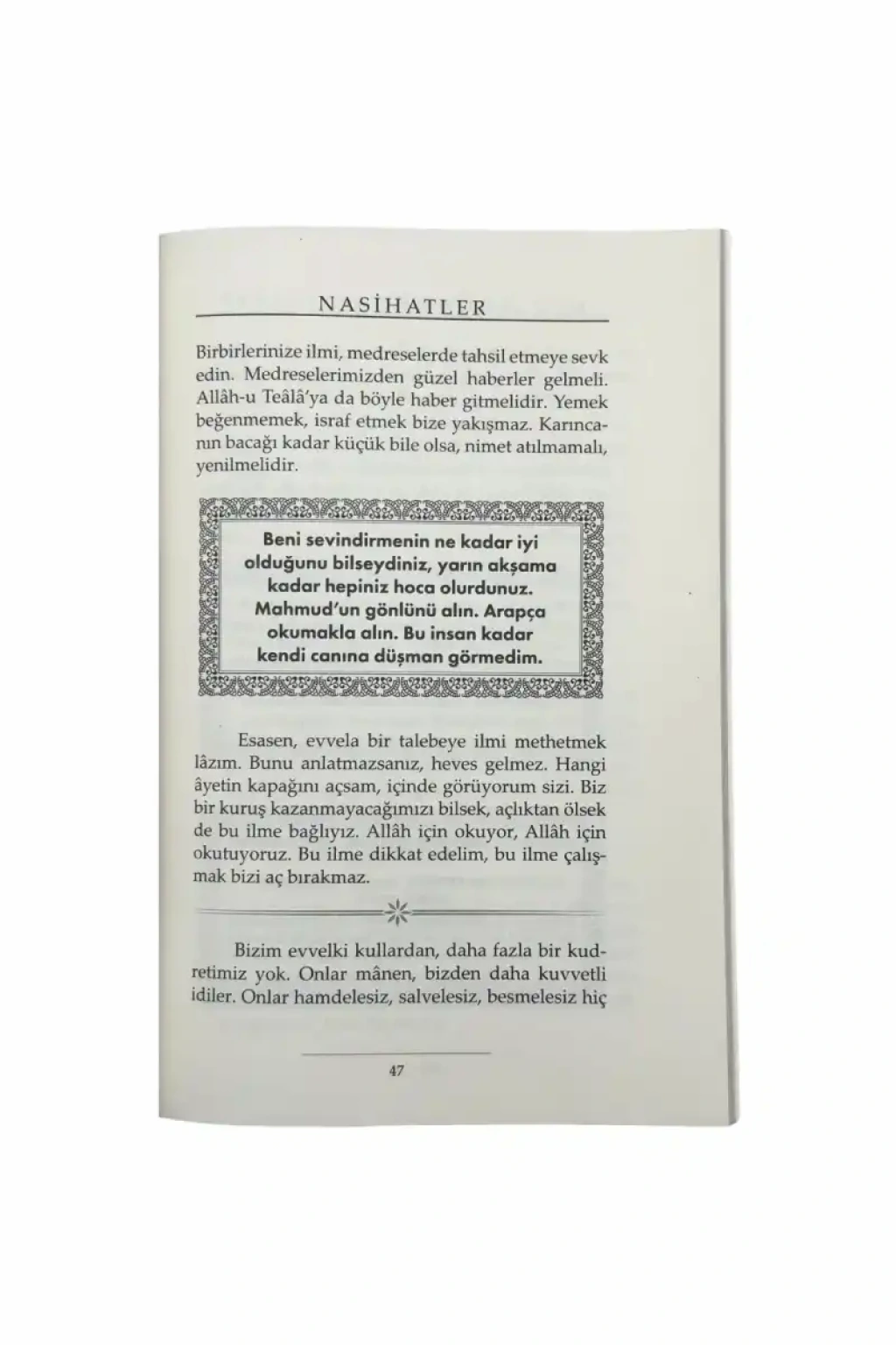 Risalemizin içindeki bu kıymetli nasihatlerin dünya-ahiret saadetimize ve özellikle de ilim erbabı kardeşlerimize Mevla Teâlâ’nın istediği gibi bir alim, âlime; Mahmud Efendi Hazretlerimizin de razı olduğu müderrisliğe vesile olmasını Cenab-ı Allah’tan niyaz ederiz.