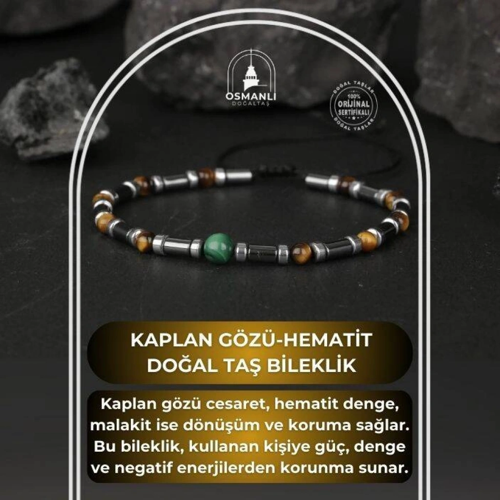 TÜM TAŞLARIMIZ SERTİFİKALI ve %100 ORJİNAL GERÇEK DOĞAL TAŞTIR. Doğal taş takılarının bu eşsiz güzelliği ve dayanıklılığıyla en kaliteli ve en özel takıları sunuyoruz. Her takı, tasarımcılarımız tarafından tasarlanmış, doğal taşların renkleri ve enerjileri ile birlikte, boyut ve uygun olanı seçmenizi sağlar. Doğal taş takılarımız, herhangi bir moda stiline mükemmel bir şekilde uyum sağlar. Aynı zamanda doğal güzelliklerini ayırmak isteyenler için harika bir seçenek sunuyorlar. Kendinizi özel hissetmek istediğinizde, doğal taş takılarımız sizin için mükemmel bir seçenek olacaktır. Ürün İçeriğindeki Taşlar Aşağıda Listelenmiştir. Hematit Taşı Özellikleri: Hayatta kalma iç güdüsünü arttırır. Cesaret, birimleri birleştirir ve artırır. Cesaret, iradeyi birleştirir ve yükseltir. Kaplan Gözü Taşı Özellikleri: İrade gücü yükseltilir. Nazara iyi gelir. Odaklanmayı arttırır. Baş ağrısını hafifletir. Berrak bir bakış açısı sunar. Malakit Taşı Özellikleri: Enerjileri temizler. Radyasyonu emer. Kalbi sorgusuz, sorgusuz aşklara açılır. İstenmeyen bağlar ve gizli insanları uzaklaştırmayı sağlar. Riske dayanma cesareti verir.