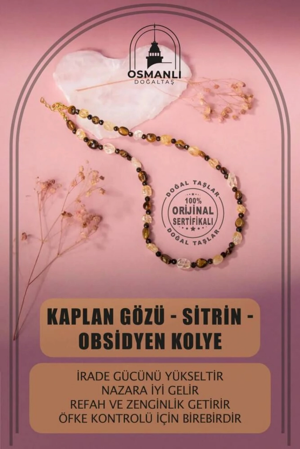 TÜM TAŞLARIMIZ SERTİFİKALI ve %100 ORJİNAL GERÇEK DOĞAL TAŞTIR. Doğal taş takılarının bu eşsiz güzelliği ve faydalarıyla müşterilerimize en kaliteli ve en özel takıları sunuyoruz. Her bir takı, tasarımcılarımız tarafından özenle hazırlanmış, doğal taşların renkleri ve enerjileri ile birlikte, size en uygun olanı seçmenizi sağlar. Doğal taş takılarımız, herhangi bir moda stiline mükemmel bir şekilde uyum sağlar. Aynı zamanda doğanın eşsiz güzelliklerini keşfetmek isteyenler için de harika bir seçenek sunarlar. Kendinizi özel hissetmek istediğinizde, doğal taş takılarımız sizin için mükemmel bir seçenek olacaktır. Ürün İçeriğindeki Taşlar Aşağıda Listelenmiştir. Kaplan Gözü Taşı Özellikleri: İrade gücünü yükseltir. Nazara iyi gelir. Odaklanmayı artırır. Baş ağrısını hafifletir. Berrak bir bakış açısı sunar. Sitrin Taşı Özellikleri: Refah ve zenginlik getirir. Keyif verir, keyiflendirir. İletişimi kuvvetlendirir, konsantrasyonu artırır ve aklı geliştirir. Golden Obsidyen Taşı Özellikleri: Öfke kontrolü için birebirdir. Negatif duygu, his ve enerjiye karşı kalkan görevi görür. Kişinin kendisini, özünü tanımasına yardımcı olur.