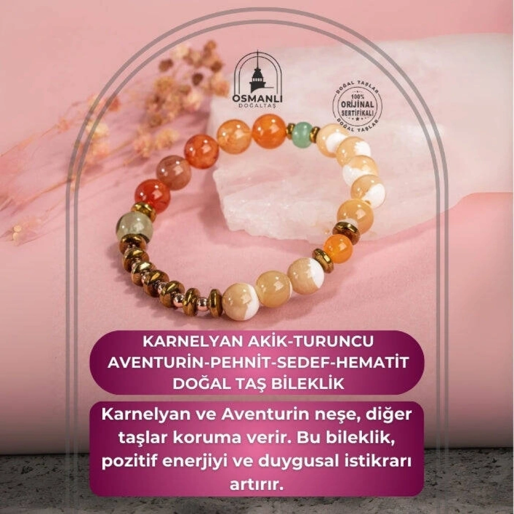 TÜM TAŞLARIMIZ SERTİFİKALI ve %100 ORJİNAL GERÇEK DOĞAL TAŞTIR. Doğal taş takılarının bu eşsiz güzelliği ve faydalarıyla müşterilerimize en kaliteli ve en özel takıları sunuyoruz. Her bir takı, tasarımcılarımız tarafından özenle hazırlanmış, doğal taşların renkleri ve enerjileri ile birlikte, size en uygun olanı seçmenizi sağlar. Doğal taş takılarımız, herhangi bir moda stiline mükemmel bir şekilde uyum sağlar. Aynı zamanda doğanın eşsiz güzelliklerini keşfetmek isteyenler için de harika bir seçenek sunarlar. Kendinizi özel hissetmek istediğinizde, doğal taş takılarımız sizin için mükemmel bir seçenek olacaktır. Ürün İçeriğindeki Taşlar Aşağıda Listelenmiştir. Karnelyan Akik Taşı Özellikleri Kişinin hayata, olumlu ve sevgi dolu bakmasını sağlar. Cinsel gücü ve performansı yükseltir. Uyuşukluk ve rehaveti uzaklaştırır. Olumsuz ve kişiyi tüketen duyguları giderir. Hayatın her alanında başarı için motivasyon sağlar. Turuncu Aventurin Taşı Özellikleri Kararsızlığa iyi gelir, kalbi korur, sakinlik ve dinginlik verir, korku ve huzursuzluğu giderir. Sedef Taşı Özellikleri Cilde parlaklık verir ve güzelleştirir. Duygusal kriz ve kaygıları giderir. Refah ve bereketi çeker. Kendini ifade etme gücünü yükseltir. Hematit Taşı Özellikleri Hayatta kalma iç güdüsünü artırır. Cesaret, irade ve özgüven duygularını artırır. Cesaret, irade ve özgüven duygularını yükseltir. Prehnit Taşı Özellikleri Hayata ve her şeye sürekli hazır hissettirir. Kabus, fobi ve korkuları hafifletir. Hiperaktifliği giderir. Hayata sadelik getirir. Hayal gücü ve hafızayı kuvvetlendirir. BİLGİ: Doğal taşların faydaları günümüzde birçok kullanıcıdan alınan geri dönüşlerde defeatle gözlemlenmiştir. Kan dolaşımına ve sindirim sistemine bir ilaç gibi dahil edilememesi; enerjileri ve kullanımı açısından sunacağı faydaya inanma ön koşulu gerektirmesiyle kesinlikle bir ilaç mahiyetinde değildir. Fakat geçmişten günümüze Biruni ve İbn-i Sina gibi büyük tıp alimleri doğal taşlar üzerinde düşünmüş, araştırmış ve geliştirdikleri tedavi yöntemlerine dahil etmişlerdir.Doğal taşların faydaları bilimsel bir deney-gözlem sürecinden ziyade geçmişte yaşayan toplumların ve tıp alimlerinin kullanım amaçlarına istinaden belirlenmekte, tespit edilmektedir. Bil biliyoruz ki şifa sadece Allah’tandır. Nereden ve nasıl geleceği belli olmaz. KAYNAK: Osmanlı Doğaltaş taşların özellikleri ve kullanım bilgileri için aşağıdaki kaynaklardan faydalanmaktadır.Walter Schumann, Gemstones Of The World (Sterling Yayın Evi, 17. Baskı).Judy Hall, Değerli Taşlar Kitabı (Alfa Basım Yayın, 3. Basım, 2021)Muhammed Bin Mahmud-ı Şirvani, Tuhfe-i Muradi. Hazırlayan: Mustafa Argunşah (Türk Dil Kurumu, 1999)Patrick Voillot, Elmaslar ve Değerli Taşlar (Yapı Kredi Yayınları, 1. Baskı, 2013)