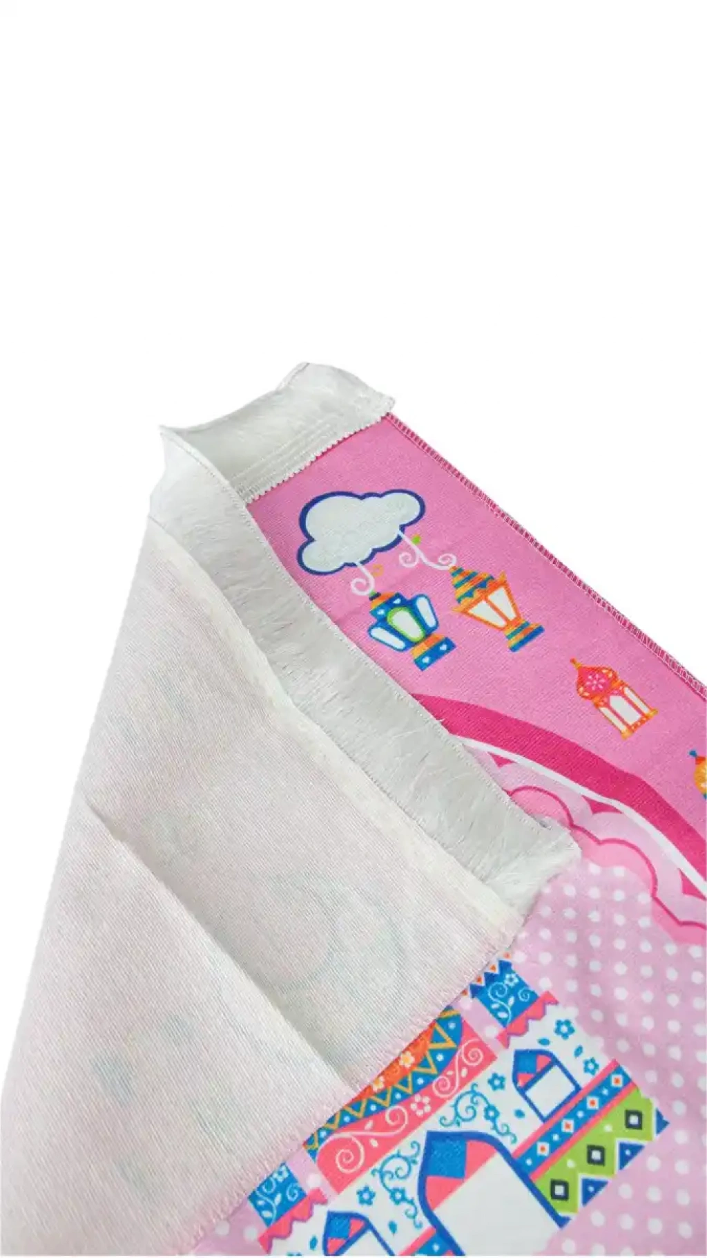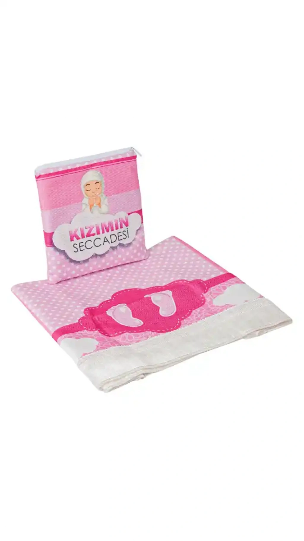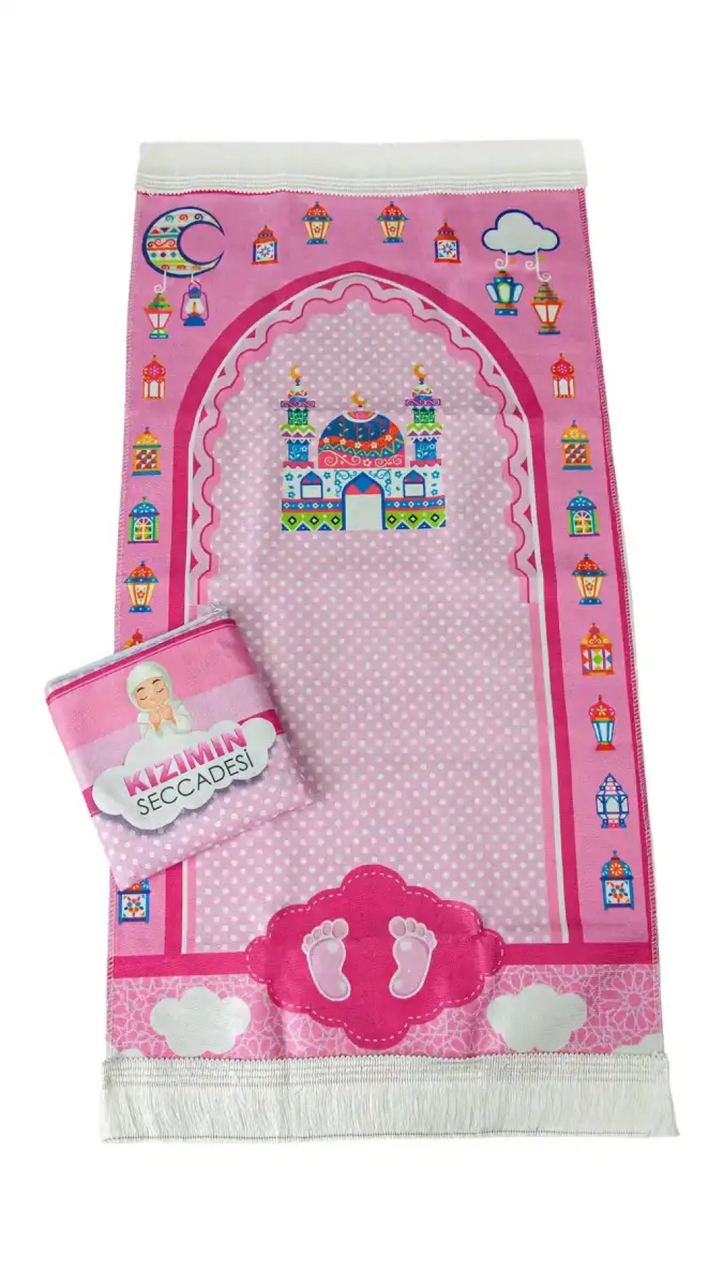 Pembe çantalı çocuk seccadesi. Bu seccade, çocukları ibadete teşvik eden renkli ve çekici tasarımlara sahiptir. Seccadenin boyutu 45 x 80 cm'dir ve 120 gram ağırlığındadır. Çantanın boyutu 18 x 18 cm olup, toplam ağırlığı 146 gramdır.