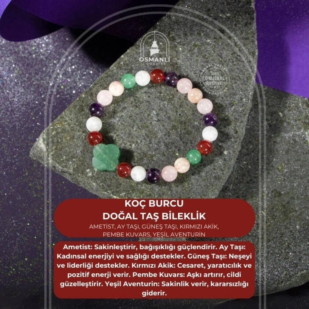 TÜM TAŞLARIMIZ SERTİFİKALI ve %100 ORJİNAL GERÇEK DOĞAL TAŞTIR. Doğal taş takılarının bu eşsiz güzelliği ve faydalarıyla müşterilerimize en kaliteli ve en özel takıları sunuyoruz. Her bir takı, tasarımcılarımız tarafından özenle hazırlanmış, doğal taşların renkleri ve enerjileri ile birlikte, size en uygun olanı seçmenizi sağlar. Doğal taş takılarımız, herhangi bir moda stiline mükemmel bir şekilde uyum sağlar. Aynı zamanda doğanın eşsiz güzelliklerini keşfetmek isteyenler için de harika bir seçenek sunarlar. Kendinizi özel hissetmek istediğinizde, doğal taş takılarımız sizin için mükemmel bir seçenek olacaktır. Ürün İçeriğindeki Taşlar Aşağıda Listelenmiştir. Ametist Taşı Özellikleri: Bağışıklığı yükseltir, sakinleştirici ve rahatlatıcıdır, uyku problemlerine giderir ve yoğun duygu ataklarını önler. Ay Taşı Özellikleri: Her kadında olması gereken başlıca taştır. Kadın taşıdır. Kadınsal rahatsızlıklara iyi gelir. Kadınsal, dişil enerjiyi ve hormonları artırır, teşvik eder. Güneş Taşı Özellikleri: Hayırseverliği ve erdemli olmayı aşılar. Hayattan zevk almayı ve keyif almayı artırır. Liderlik ruhunu ve kabiliyetini destekler. Kırmızı Akik Taşı Özellikleri: Sosyalleştirir. Yaratıcılığı, aklı ve mantığı besler. Cesareti artırır, korkuların yenilmesine yardımcı olur. Odaklanmayı artırır. Pozitif enerji verir: Rahatlatır. Stresi Giderir. Pembe Kuvars Taşı Özellikleri: Her kadında olmazsa olmaz olan taşlardandır. Romantizmi kuvvetlendirir. Çiftler arasında aşkı ve tutkuyu artırır. Cilde parlaklık verir, güzelleştirir. Yeşil Aventurin Taşı Özellikleri: Kararsızlığa iyi gelir, kalbi korur, sakinlik ve dinginlik verir, korku ve huzursuzluğu giderir.