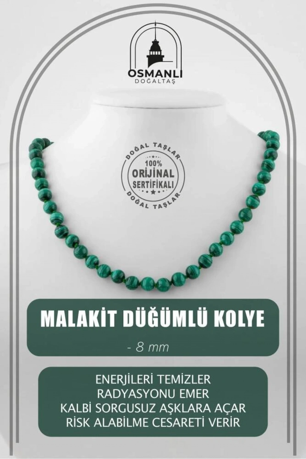 TÜM TAŞLARIMIZ SERTİFİKALI ve %100 ORJİNAL GERÇEK DOĞAL TAŞTIR. Doğal taş takılarının bu eşsiz güzelliği ve faydalarıyla müşterilerimize en kaliteli ve en özel takıları sunuyoruz. Her bir takı, tasarımcılarımız tarafından özenle hazırlanmış, doğal taşların renkleri ve enerjileri ile birlikte, size en uygun olanı seçmenizi sağlar. Doğal taş takılarımız, herhangi bir moda stiline mükemmel bir şekilde uyum sağlar. Aynı zamanda doğanın eşsiz güzelliklerini keşfetmek isteyenler için de harika bir seçenek sunarlar. Kendinizi özel hissetmek istediğinizde, doğal taş takılarımız sizin için mükemmel bir seçenek olacaktır. Ürün İçeriğindeki Taşlar Aşağıda Listelenmiştir. Malakit Taşı Özellikleri: Enerjileri temizler. Radyasyonu emer. Kalbi sorgusuz, sorgulamasız aşklara açar. İstenmeyen bağları ve istenmeyen insanları uzaklaştırmayı sağlar. Risk alabilme cesareti verir.