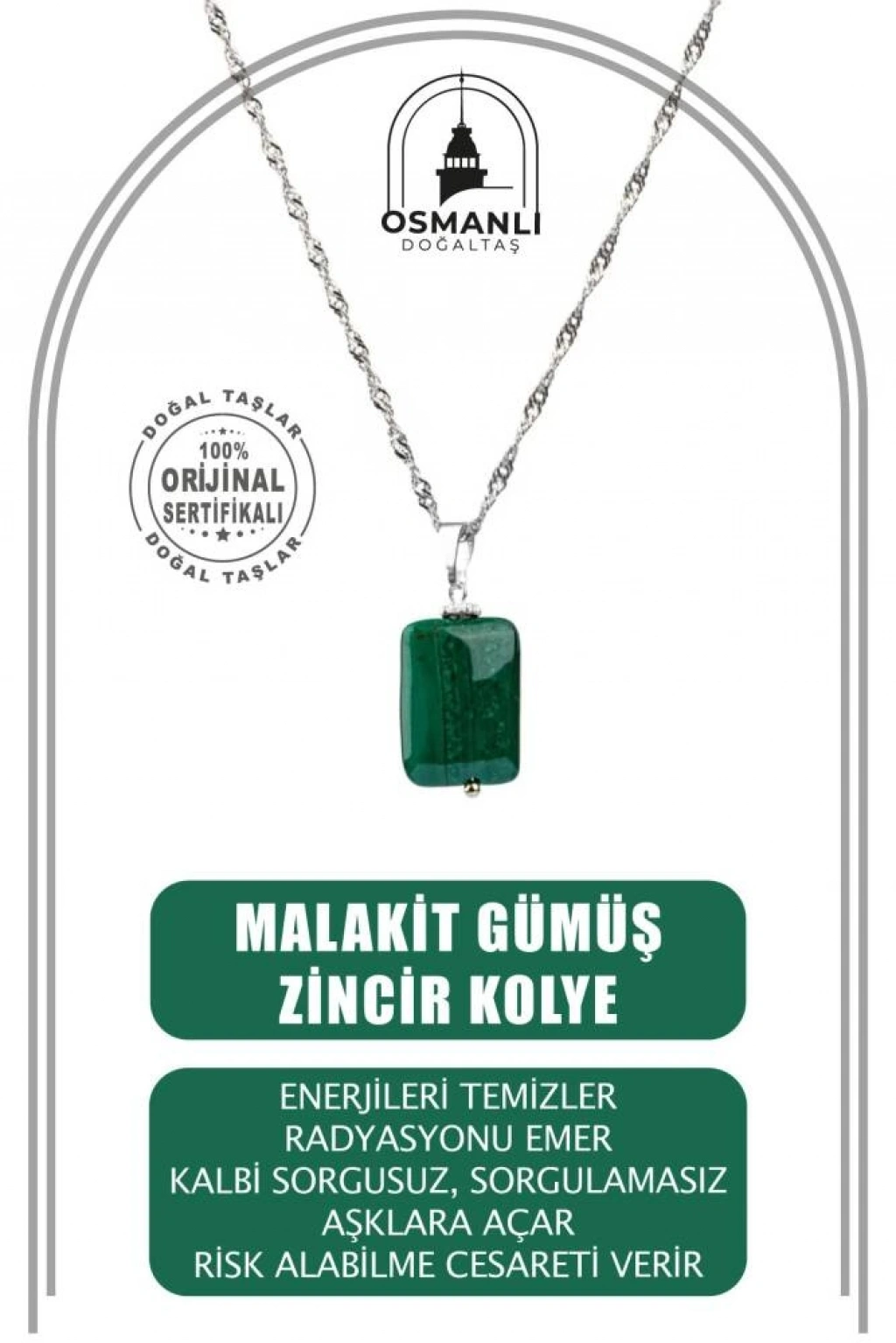 TÜM TAŞLARIMIZ SERTİFİKALI ve %100 ORJİNAL GERÇEK DOĞAL TAŞTIR. Doğal taş takılarının bu eşsiz güzelliği ve faydalarıyla müşterilerimize en kaliteli ve en özel takıları sunuyoruz. Her bir takı, tasarımcılarımız tarafından özenle hazırlanmış, doğal taşların renkleri ve enerjileri ile birlikte, size en uygun olanı seçmenizi sağlar. Doğal taş takılarımız, herhangi bir moda stiline mükemmel bir şekilde uyum sağlar. Aynı zamanda doğanın eşsiz güzelliklerini keşfetmek isteyenler için de harika bir seçenek sunarlar. Kendinizi özel hissetmek istediğinizde, doğal taş takılarımız sizin için mükemmel bir seçenek olacaktır. Ürün İçeriğindeki Taşlar Aşağıda Listelenmiştir. Malakit Taşı Özellikleri: Enerjileri temizler. Radyasyonu emer. Kalbi sorgusuz, sorgulamasız aşklara açar. İstenmeyen bağları ve istenmeyen insanları uzaklaştırmayı sağlar. Risk alabilme cesareti verir.