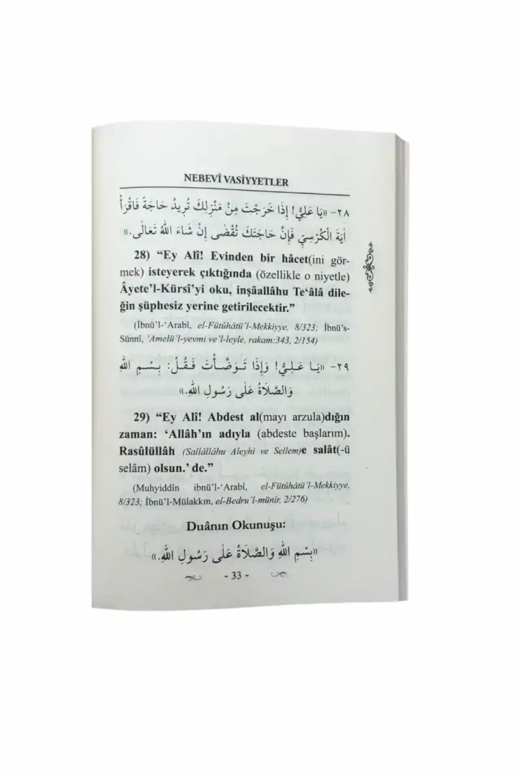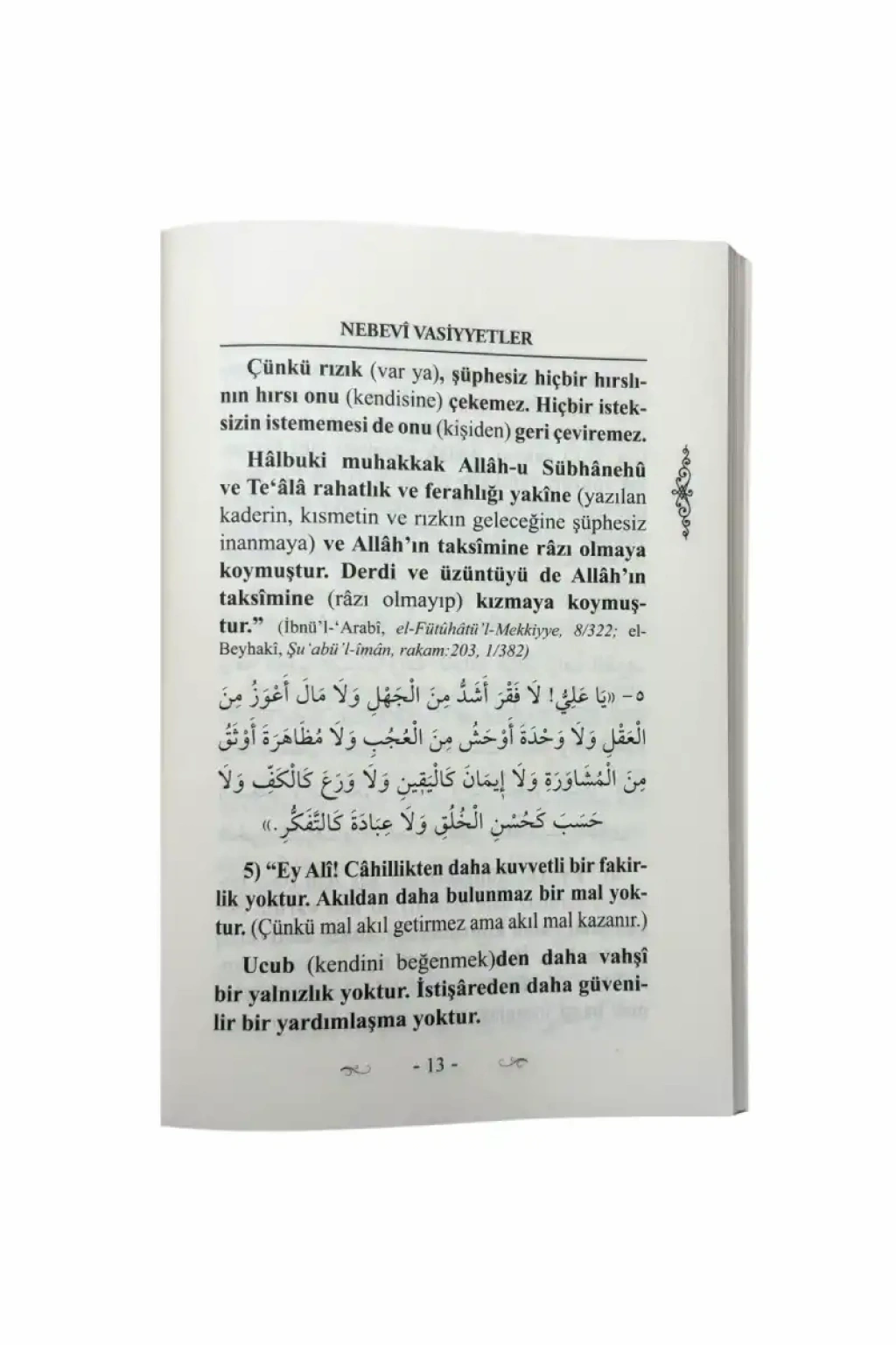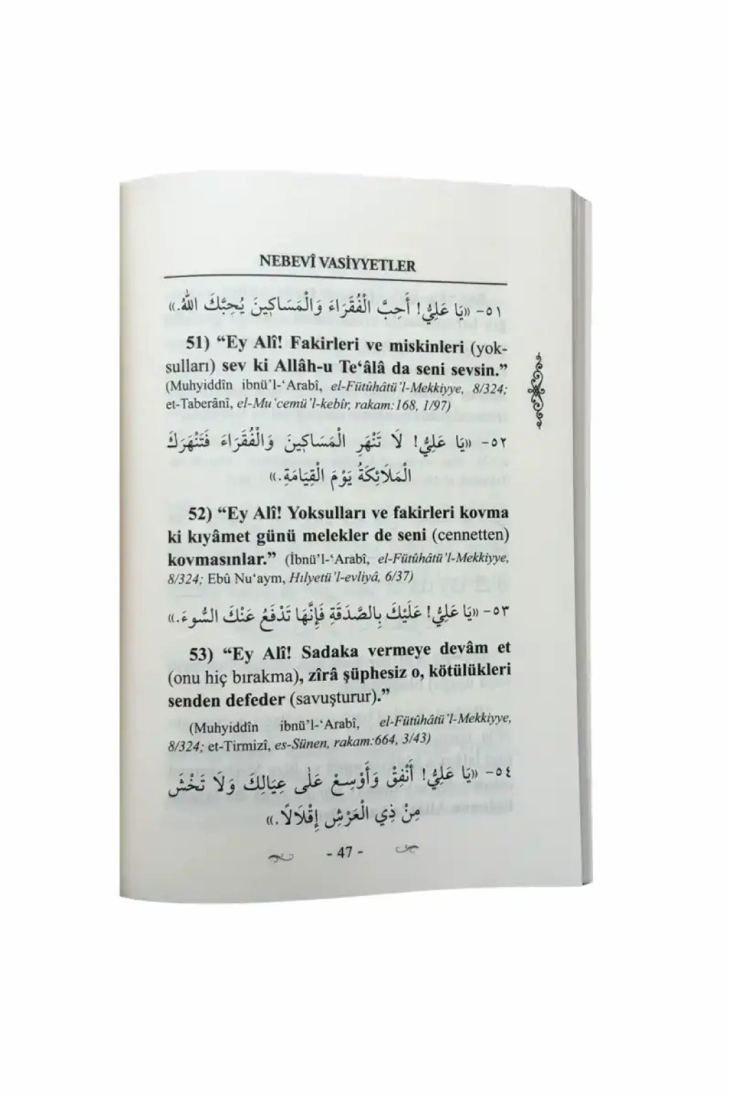 İbni Arabî (Kuddise Sirruhû) “el-Fütûhâtü’l-Mekkiyye” isimli eserinin 560. bâbının içerisinde “Vesâyâ Nebeviyye (Nebevî Vasiyetler)” diye bir başlık açmış ve bu başlık altında Rasûlüllâh (Sallâllâhu Aleyhi ve Sellem)in Alî ibni Ebî Tâlib (Radıyallâhu Anh)a tavsiye buyurduğu 92 vasiyeti ihtivâ eden bir hadîs-i şerîfi beyân sadedinde: “Alî ibni Ebî Tâlib (Radıyallâhu Anh) Hazretleri’nin şöyle buyurduğu bize (isnâdıyla) rivâyet olundu: