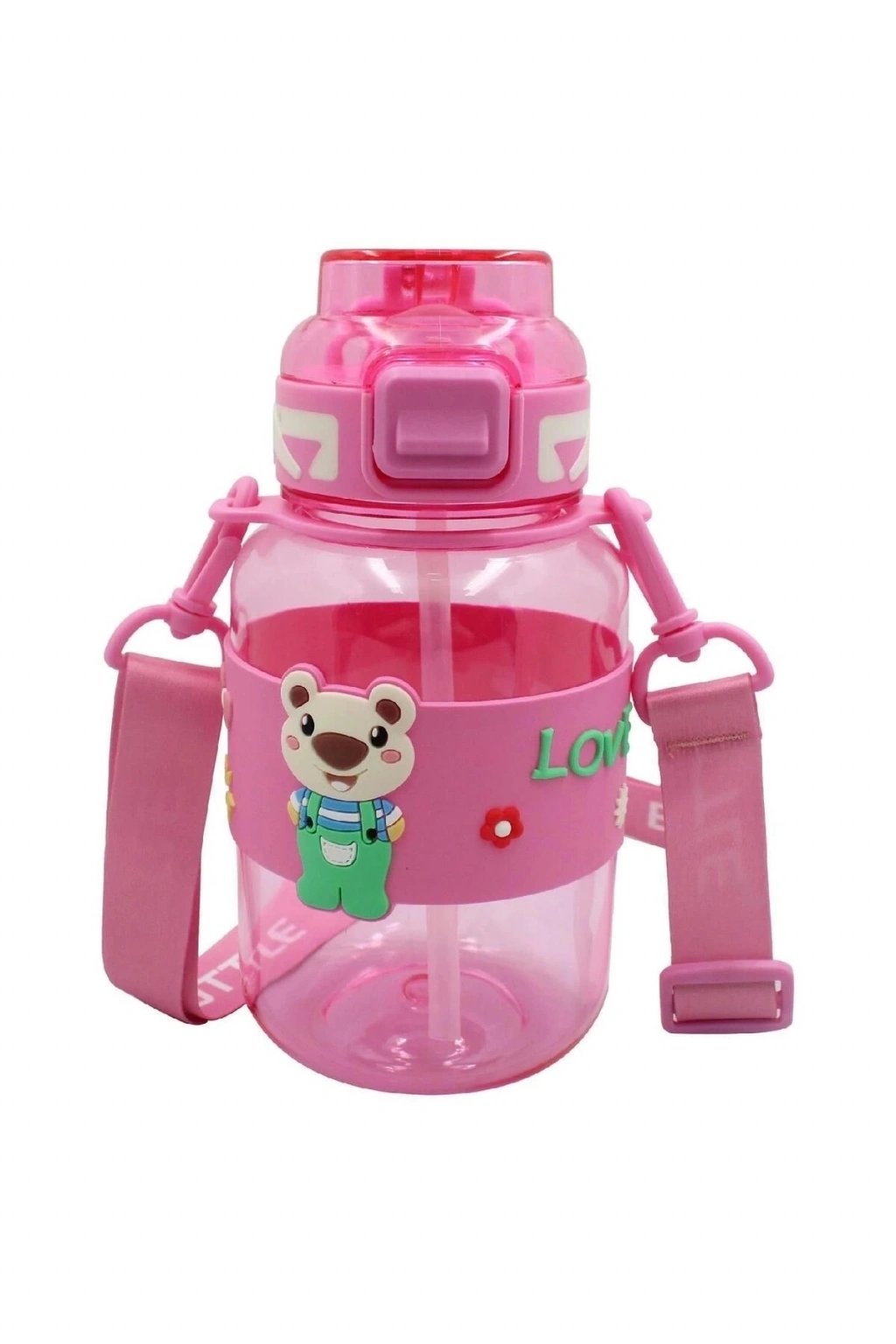 Noki Kids Su Matarası Pembe Petg Pipetli Kapak Ayıcık Silikon Kemerli Askılı 800 ml