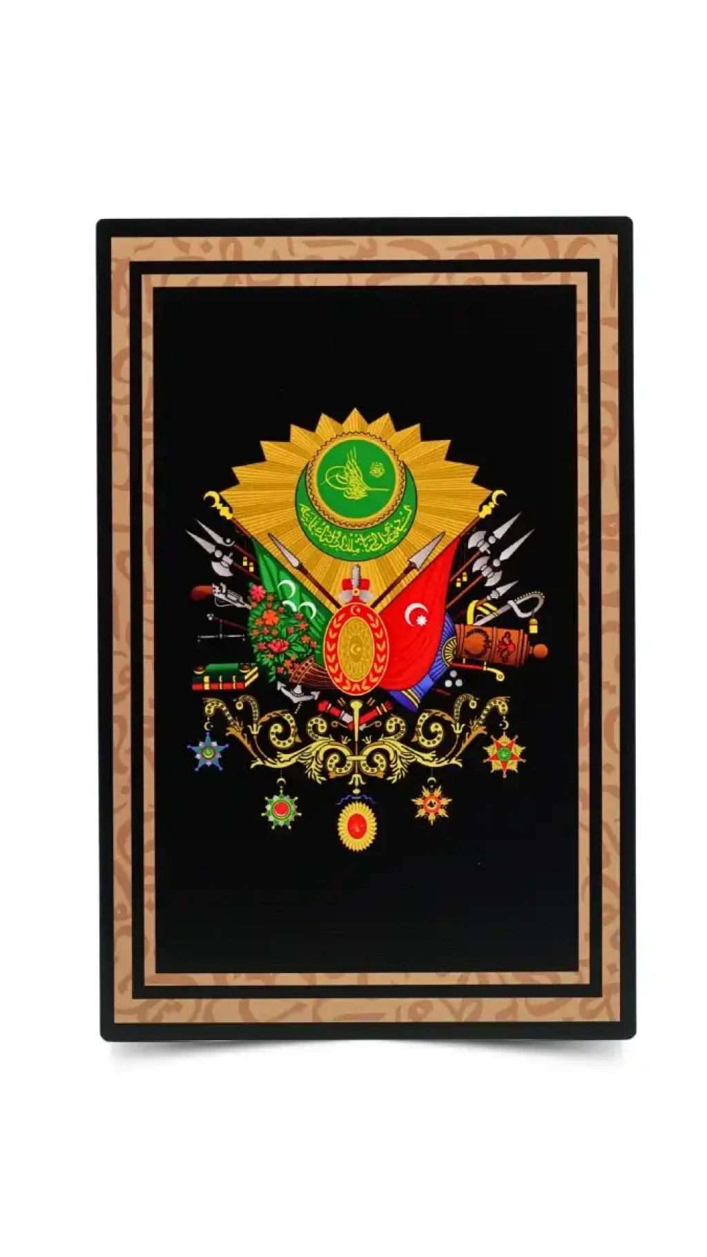 Tablonun merkezinde yer alan Osmanlı Devlet Arması, detaylarıyla göz doldururken, etrafındaki hat desenli çerçeveyle klasik şıklığı tamamlar.