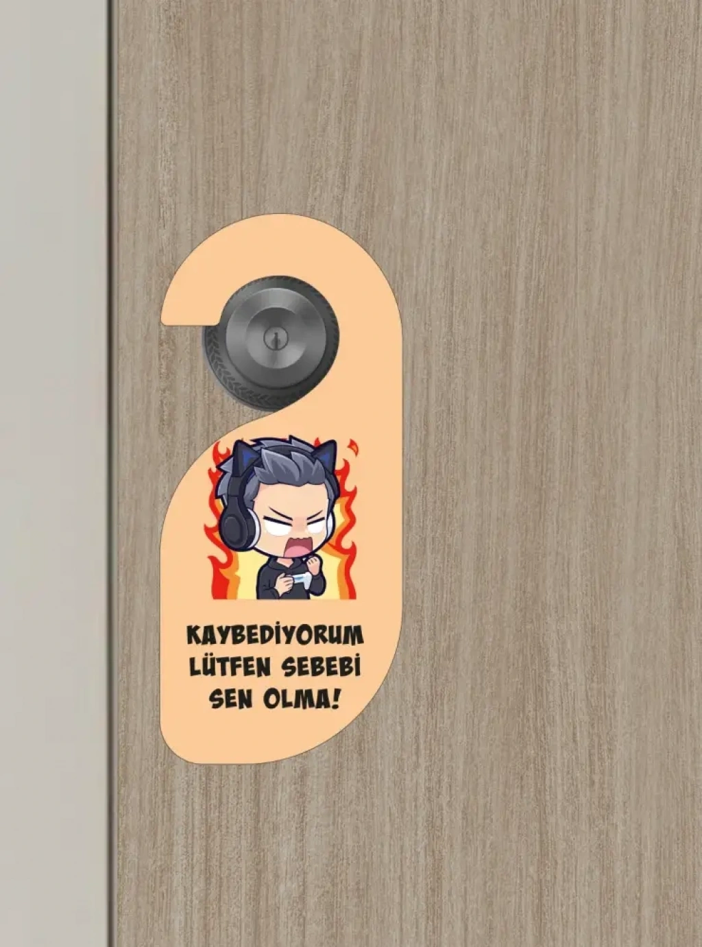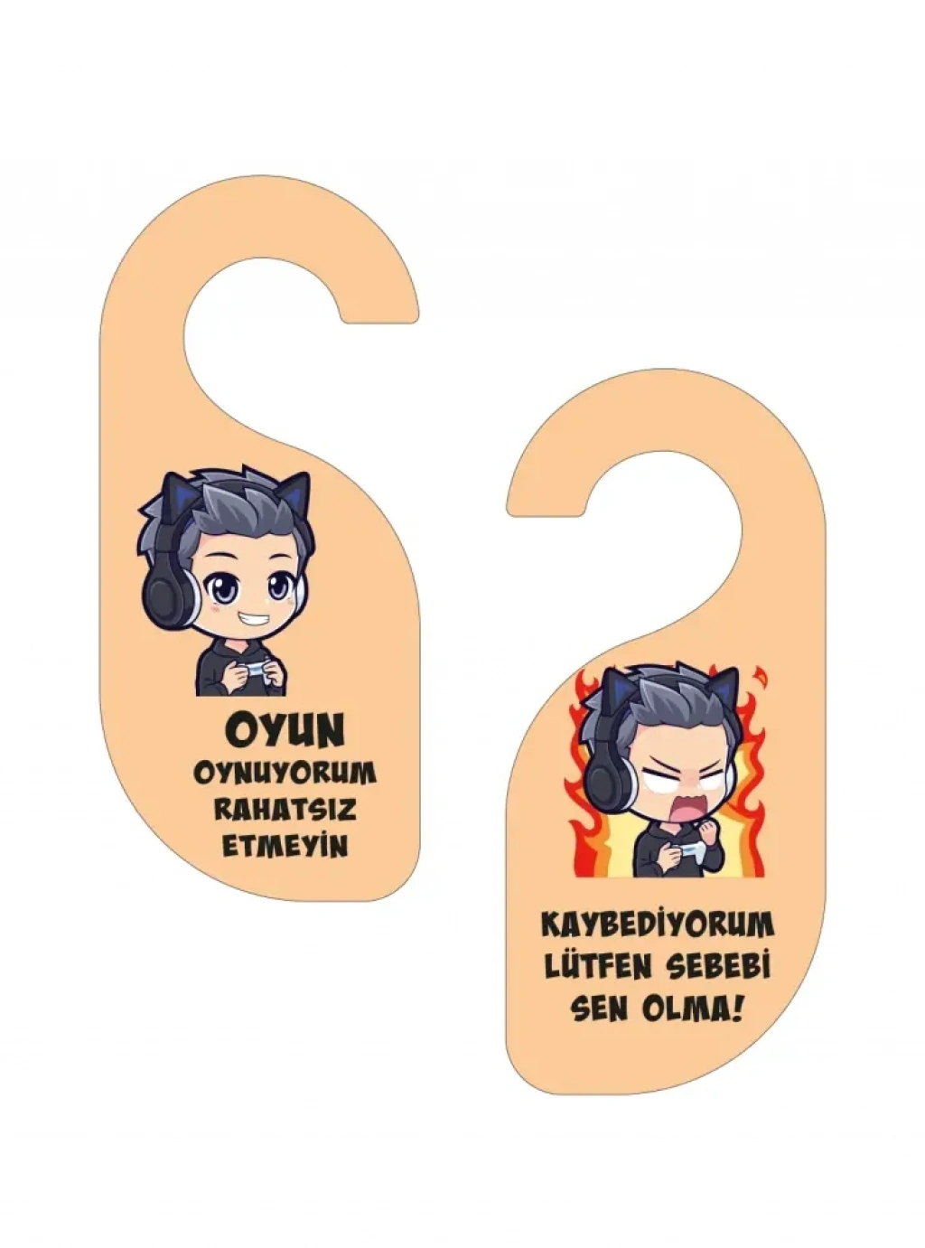 Bir yüzünde “Oyun Oynuyorum Rahatsız Etmeyin”, diğer yüzünde ise esprili bir şekilde “Kaybediyorum, Lütfen Sebebi Sen Olma” yazısı bulunur. Çizgi film tarzı karakter tasarımıyla hem eğlenceli hem de dikkat çekici bir üründür.