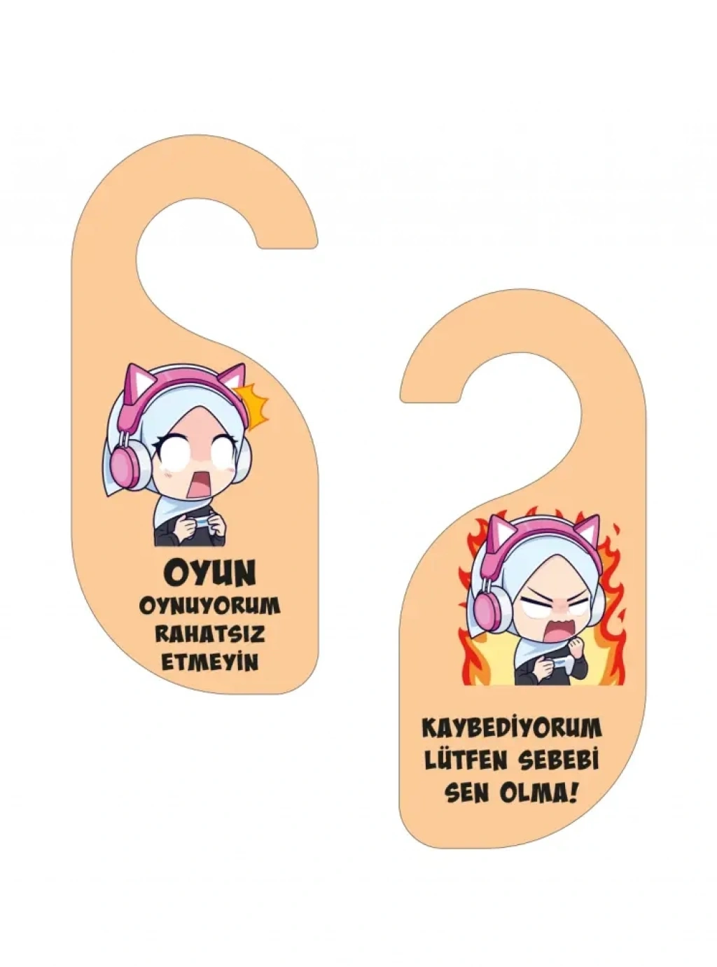Bir yüzünde “Oyun Oynuyorum Rahatsız Etmeyin”, diğer yüzünde ise esprili bir şekilde “Kaybediyorum, Lütfen Sebebi Sen Olma” yazısı bulunur. Çizgi film tarzı karakter tasarımıyla hem eğlenceli hem de dikkat çekici bir üründür.