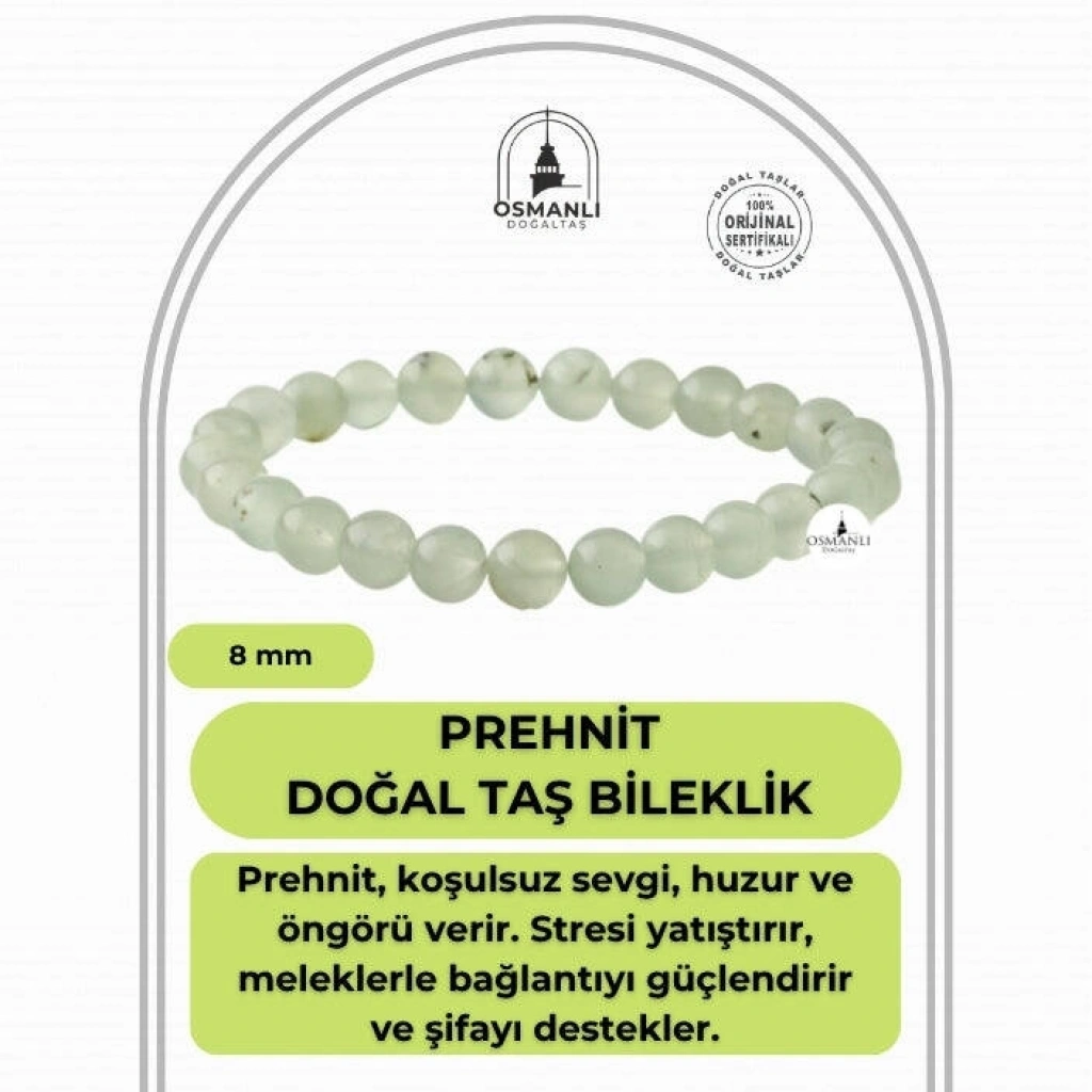 TÜM TAŞLARIMIZ SERTİFİKALI ve %100 ORJİNAL GERÇEK DOĞAL TAŞTIR. Doğal taş takılarının bu eşsiz güzelliği ve faydalarıyla müşterilerimize en kaliteli ve en özel takıları sunuyoruz. Her bir takı, tasarımcılarımız tarafından özenle hazırlanmış, doğal taşların renkleri ve enerjileri ile birlikte, size en uygun olanı seçmenizi sağlar. Doğal taş takılarımız, herhangi bir moda stiline mükemmel bir şekilde uyum sağlar. Aynı zamanda doğanın eşsiz güzelliklerini keşfetmek isteyenler için de harika bir seçenek sunarlar. Kendinizi özel hissetmek istediğinizde, doğal taş takılarımız sizin için mükemmel bir seçenek olacaktır. Ürün İçeriğindeki Taşlar Aşağıda Listelenmiştir. Prehnit Taşı Özellikleri: Hayata ve her şeye sürekli hazır hissettirir. Kabus, fobi ve korkuları hafifletir. Hiperaktifliği giderir. Hayata sadelik getirir. Hayal gücü ve hafızayı kuvvetlendirir. BİLGİ: Doğal taşların faydaları günümüzde birçok kullanıcıdan alınan geri dönüşlerde defeatle gözlemlenmiştir. Kan dolaşımına ve sindirim sistemine bir ilaç gibi dahil edilememesi; enerjileri ve kullanımı açısından sunacağı faydaya inanma ön koşulu gerektirmesiyle kesinlikle bir ilaç mahiyetinde değildir. Fakat geçmişten günümüze Biruni ve İbn-i Sina gibi büyük tıp alimleri doğal taşlar üzerinde düşünmüş, araştırmış ve geliştirdikleri tedavi yöntemlerine dahil etmişlerdir.Doğal taşların faydaları bilimsel bir deney-gözlem sürecinden ziyade geçmişte yaşayan toplumların ve tıp alimlerinin kullanım amaçlarına istinaden belirlenmekte, tespit edilmektedir. Bil biliyoruz ki şifa sadece Allah’tandır. Nereden ve nasıl geleceği belli olmaz. KAYNAK: Osmanlı Doğaltaş taşların özellikleri ve kullanım bilgileri için aşağıdaki kaynaklardan faydalanmaktadır.Walter Schumann, Gemstones Of The World (Sterling Yayın Evi, 17. Baskı).Judy Hall, Değerli Taşlar Kitabı (Alfa Basım Yayın, 3. Basım, 2021)Muhammed Bin Mahmud-ı Şirvani, Tuhfe-i Muradi. Hazırlayan: Mustafa Argunşah (Türk Dil Kurumu, 1999)Patrick Voillot, Elmaslar ve Değerli Taşlar (Yapı Kredi Yayınları, 1. Baskı, 2013)