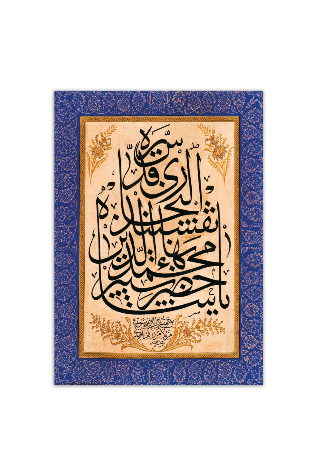 Çerçevedeki derin mavi nakış (nakş-ı) desenleri, geleneksel İslam sanatındaki tezhip ve tezyinat zevkini yansıtır; sanatın sadece göze değil, ruha hitap eden yönünü vurgular.