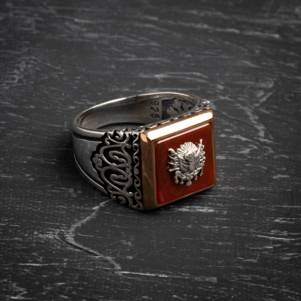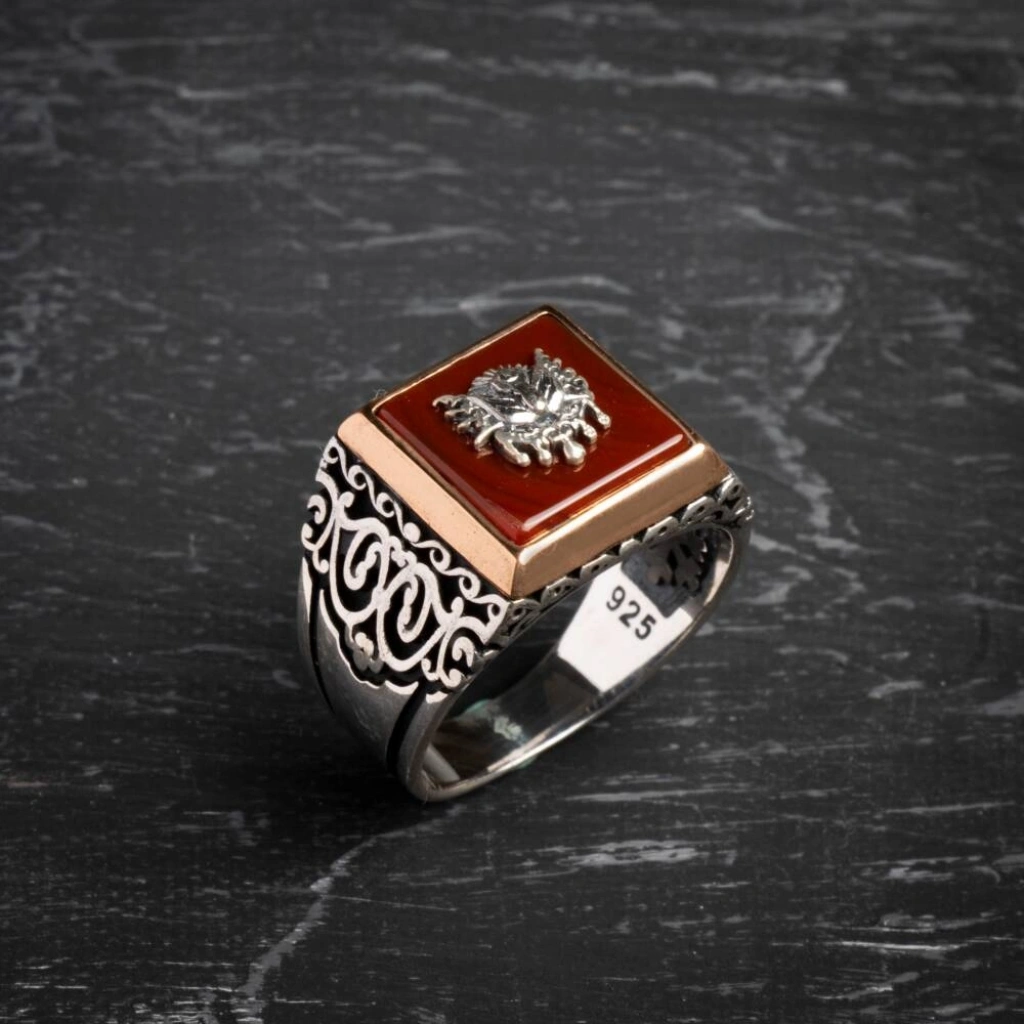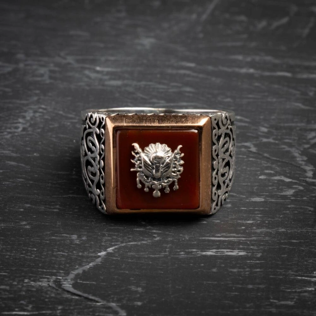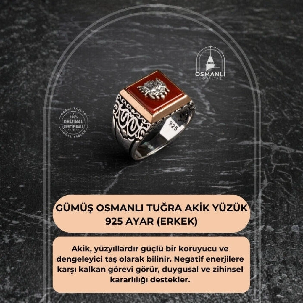 Sertifikalı 925 Ayar Gümüş Osmanlı Tuğra Akik Yüzük (Erkek) Tarihin gücünü, koruma enerjisini ve asil mirasını parmağınızda taşıyın! Akik doğal taşının dengeleyici enerjisi, görkemli Osmanlı Tuğrası motifiyle birleşerek bu özel yüzükte hayat buluyor. Yüzüğümüz, Sertifikalı 925 Ayar Gümüş kullanılarak üretilmiştir ve güçlü bir erkek stilini tamamlamak için idealdir. Akik, Tuğra ve Gümüşün Asil Sinerjisi Akik (Koruma ve Denge): Akik, yüzyıllardır güçlü bir koruyucu ve dengeleyici taş olarak bilinir. Negatif enerjilere karşı kalkan görevi görür, duygusal ve zihinsel kararlılığı destekler. Osmanlı Tuğrası (Tarih ve Güç): Yüzüğün üzerindeki Osmanlı Tuğrası motifi, görkemi, asaleti ve köklü tarihi simgeler. Taşıyana güçlü bir miras ve aidiyet hissi katar. Sertifikalı Güvenilirlik: Yüzüğün taşı sertifikalı olup, orijinalliği ve kalitesi garantilenmiştir. Kullanılan metal ise yüksek standartlı 925 Ayar Gümüş saflığındadır. Asil ve Karizmatik Duruş: Akik taşının doğal ve derin rengi, gümüşün asil parlaklığı ve Tuğra motifinin detaylarıyla birleşerek karizmatik ve etkileyici bir görünüm sunar. Bu özel yüzük, geçmişin ihtişamını ve doğal taşın koruyucu enerjisini modern bir aksesuarda birleştirir.