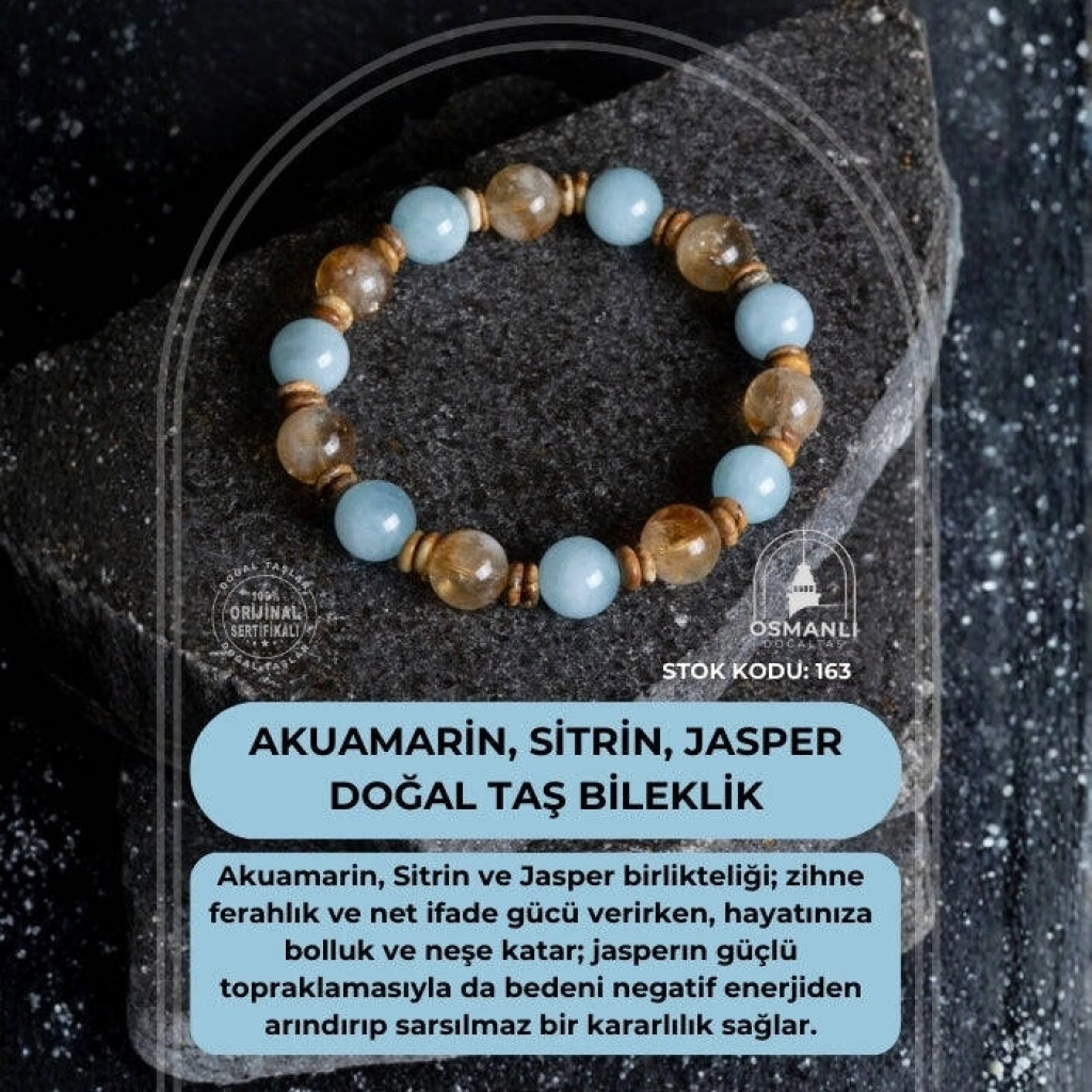 Akuamarin, Sitrin ve Jasper Doğal Taş Bileklik Huzuru hissedin, bolluğu çekin, gücünüzü sabitleyin! Doğanın en şifalı renklerini ve en güçlü frekanslarını bir araya getiren bu özel bileklik; Akuamarin’in sakinliğini, Sitrin’in bereketini ve Jasper’ın istikrarını bileğinize taşıyor. Hem zihinsel berraklık hem de ruhsal denge arayanlar için tasarlanan bu şık aksesuar, gün boyu size eşlik edecek bir enerji kalkanı görevi görür. Bu Özel Tasarımın Enerji Rehberi: Akuamarin (Dinginlik ve İletişim): 'Sakinlik Taşı' olarak bilinir. Zihindeki karmaşayı temizler, öfkeyi yatıştırır ve kendinizi daha net ifade etmenize yardımcı olur. Ruhsal bir ferahlık sağlayarak stresi uzaklaştırır. Sitrin (Bolluk ve Başarı): 'Tüccar Taşı' olarak adlandırılan Sitrin, neşe ve iyimserlik yayar. Maddi ve manevi bolluğu hayatınıza çekerken, özgüveninizi ve motivasyonunuzu en üst seviyeye çıkarır. Jasper (Sabır ve İstikrar): 'Yüce Besleyici' Jasper, en güçlü topraklama taşlarındandır. Kararlılığı artırır, bedeni negatif enerjilerden arındırır ve hayatın zorlukları karşısında sarsılmaz bir duruş sergilemenize yardımcı olur. Neden Bu Bilekliği Seçmelisiniz? Bütünsel Şifa: Ruhsal ferahlık, başarı odağı ve fiziksel direnç sağlayan üç farklı taşın mükemmel uyumu. Doğal Estetik: Akuamarin’in uçuk mavisi, Sitrin’in altın sarısı ve Jasper’ın toprak tonları ile doğanın tüm renkleri bileğinizde. %100 Gerçek Doğal Taş: Özenle seçilmiş, yüksek kalitede ve doğal formunda taşlar. Her Tarza Uygun: Minimalist ve asil duruşuyla ister spor kombinlerde ister klasik saatlerinizle mükemmel uyum.