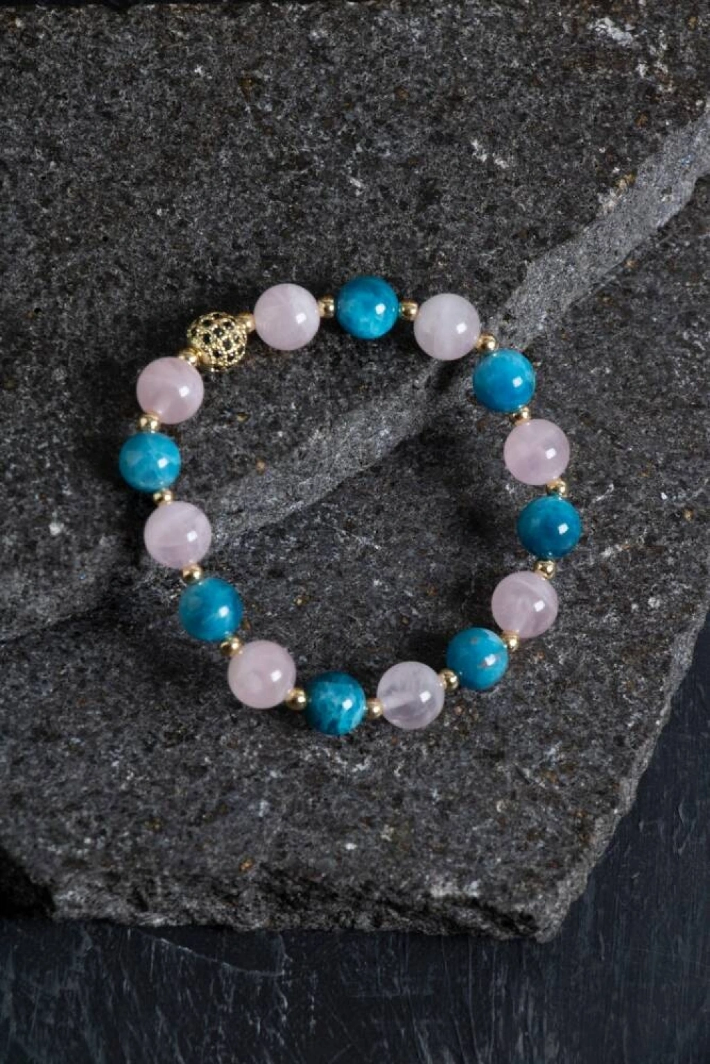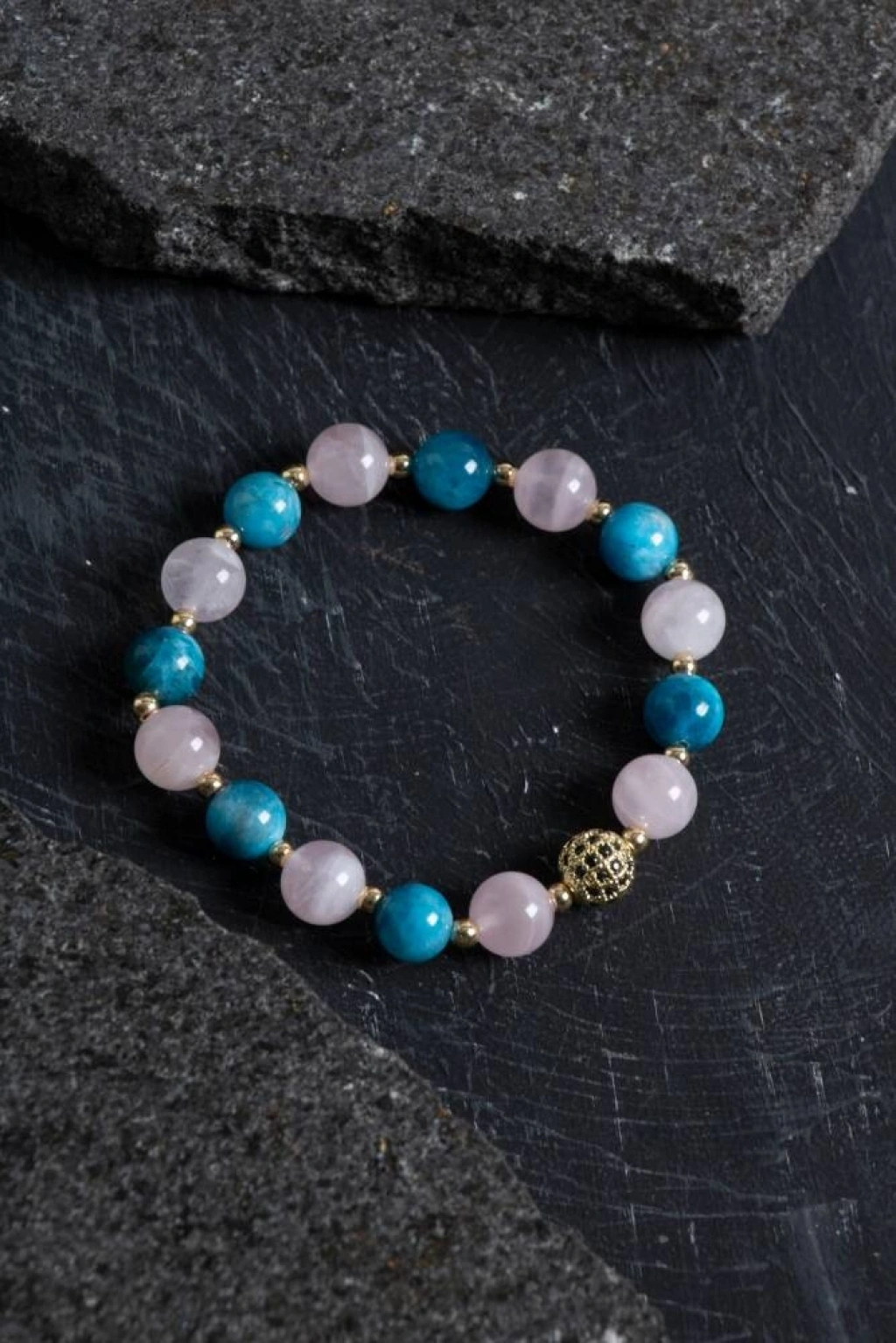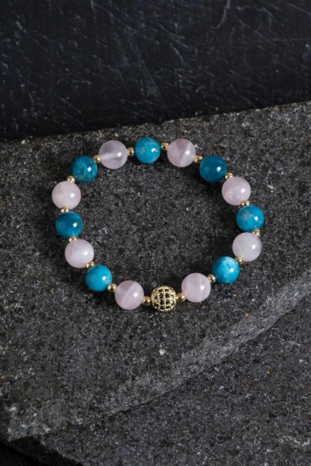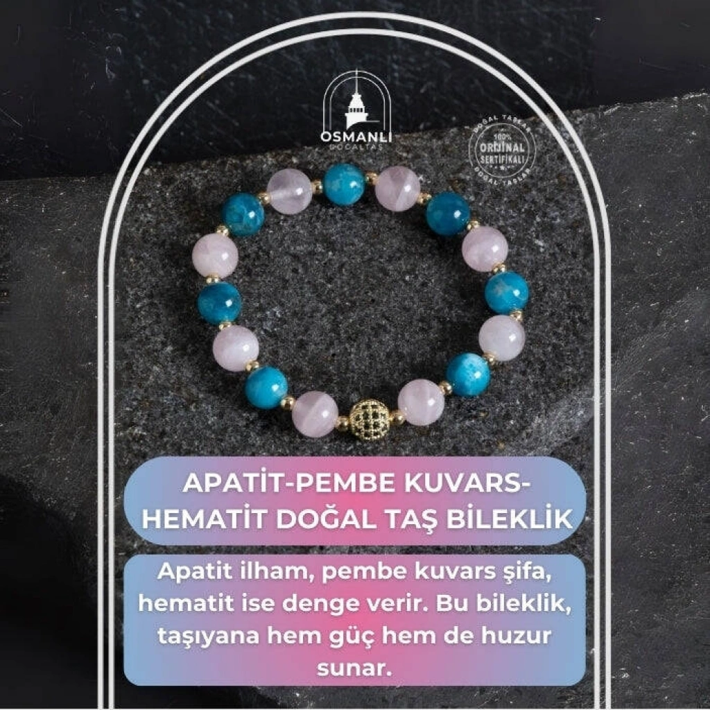 Aşkın, huzurun ve odaklanmanın enerjisini bir bileklikte buluşturan şık bir tasarım! Apatit taşı, motivasyonu artırır ve zihinsel açıklık sağlar. Pembe Kuvars, kalp çakrasını dengeleyerek sevgi, şefkat ve duygusal iyileşme getirir. Hematit, negatif enerjiyi uzaklaştırarak topraklanma sağlar. Altın detaylarla tamamlanan bu bileklik, hem ruhunuza hem stilinize ışıltı katmak için ideal. Gündelik kullanıma da özel günlere de uyum sağlar.