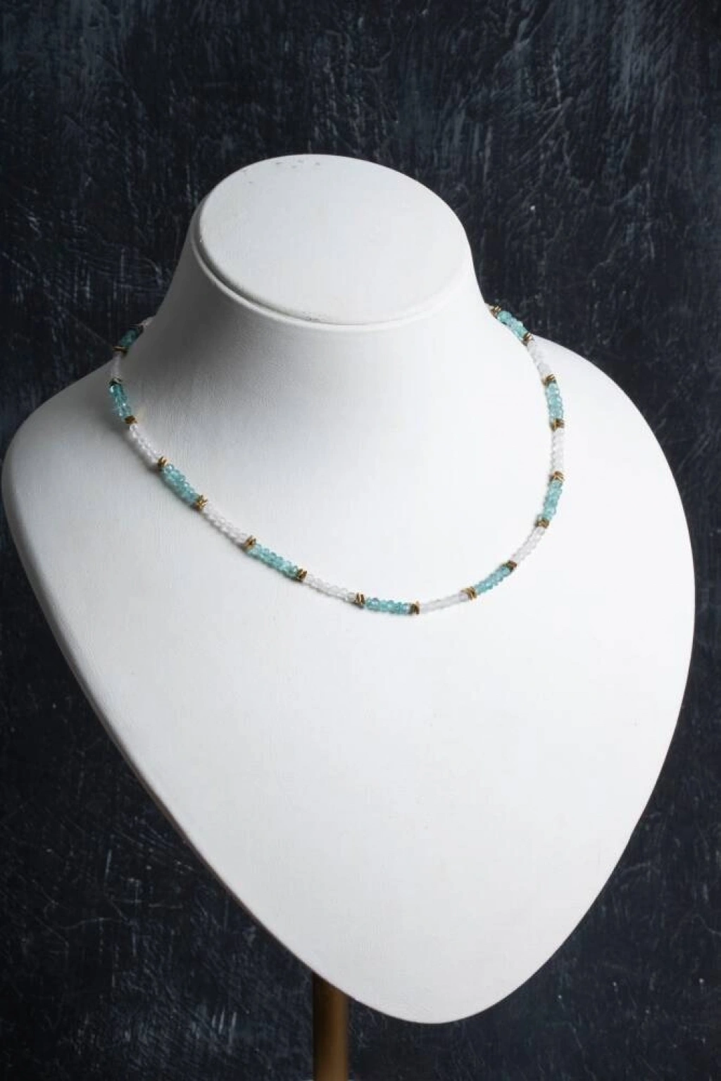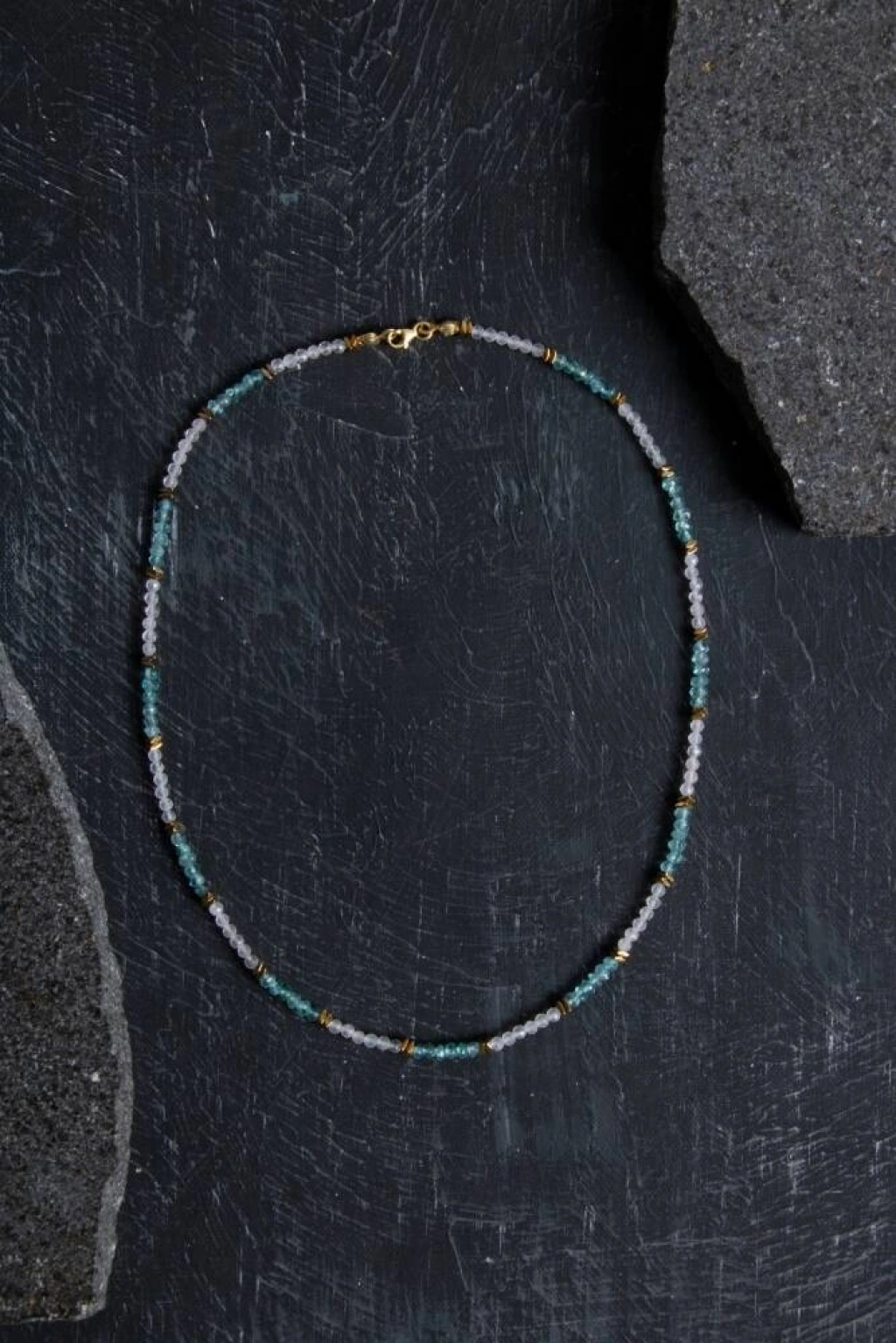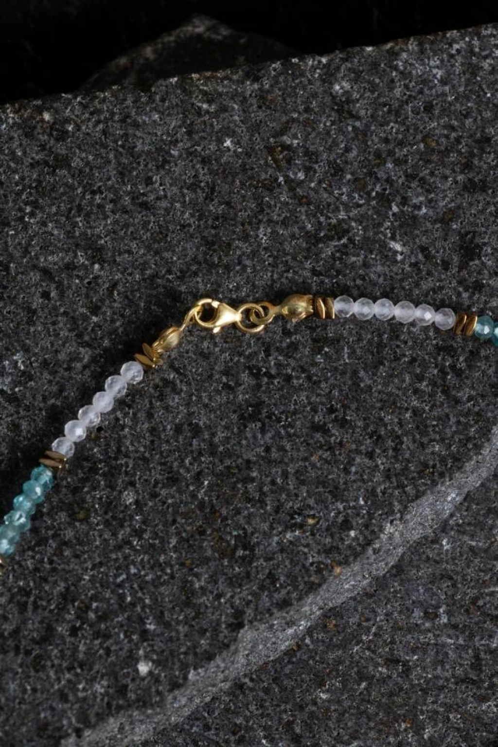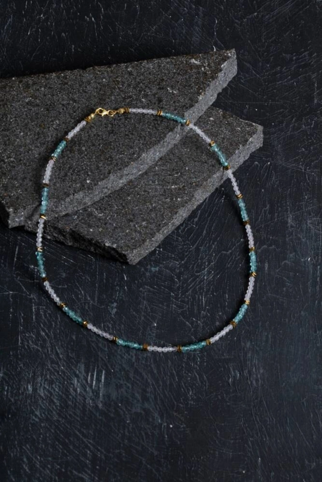 Sade ve şık tasarımıyla dikkat çeken bu kolye, sertifikalı apatit ve pembe kuvars taşlarıyla hazırlanmıştır. Apatit taşı odaklanmayı, ilhamı ve içsel motivasyonu artırırken; pembe kuvars ise sevgi, şefkat ve duygusal dengeyi destekler. İnce işçiliği ve zarif geçiş tonları sayesinde günlük kullanıma da özel günlere de uyum sağlar.