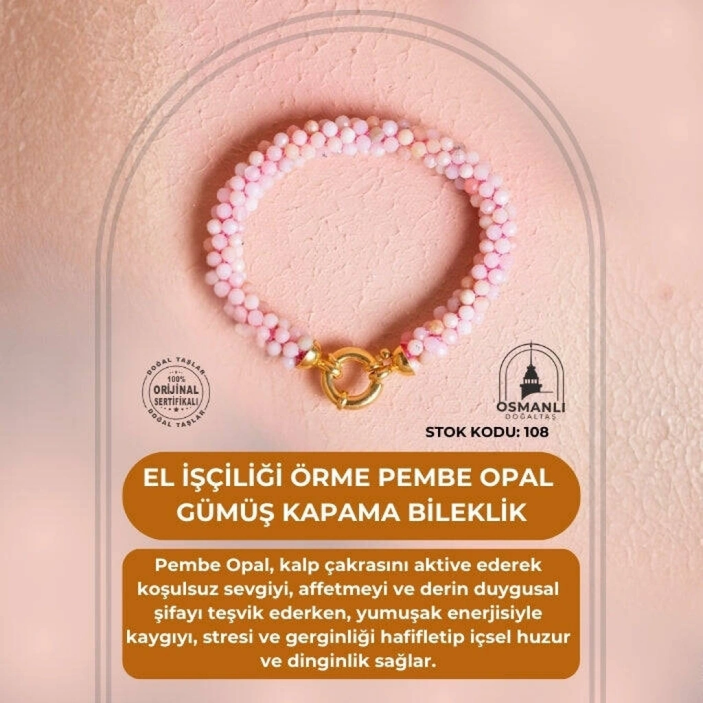 El İşçiliği Örme Pembe Opal Gümüş Kapama Bileklik Şefkati, duygusal şifayı ve saf aşkın enerjisini bileğinizde hissedin! Pembe Opal doğal taşının narin pembe ışıltısı ve kalp çakrasını açan enerjisi, usta El İşçiliği Örme tekniğiyle hazırlanmış bu özel bileklikte birleşiyor. Şık ve güvenli Gümüş Kapama detayıyla tamamlanan bu bileklik, size sürekli huzur, duygusal denge ve içsel dinginlik sağlayan güçlü bir enerji kaynağıdır. Pembe Opal Taşının Büyüleyici Faydaları ve Enerjisi Duygusal Şifa ve Aşk: Pembe Opal, kalp çakrasının en güçlü taşlarından biridir. Koşulsuz sevgiyi, affetmeyi ve derin duygusal şifayı teşvik eder. Huzur ve Dinginlik: Kaygıyı hafifletir ve stresi azaltır. İçsel sakinliği artırarak ruh halini dengelemeye yardımcı olur. Nazik Enerji: Yumuşak ve yatıştırıcı enerjisiyle hassas ruhları destekler. El İşçiliği ve Gümüşün Mükemmel Uyumu Ustalıkla Örülmüş Tasarım: Her bir Pembe Opal tanesinin özenle birleştirildiği El İşçiliği Örme tekniği, bilekliğin enerjisini güçlendirir ve cilde yumuşak, konforlu bir temas sağlar. Gümüş Kapama Güvencesi: Yüksek kaliteli Gümüş Kapama Aparatı, bilekliğe güvenli ve sağlam bir kilit sistemi sağlarken, Pembe Opal'in narin tonlarıyla lüks ve zarif bir kontrast oluşturur. Zarif Duruş: Bileğinizde asil ve duygusal bir ifade yaratan bu tasarım, hem günlük hem de özel anlar için idealdir.