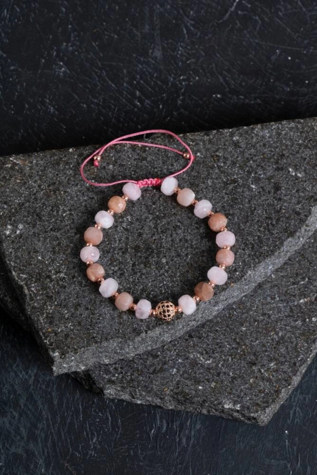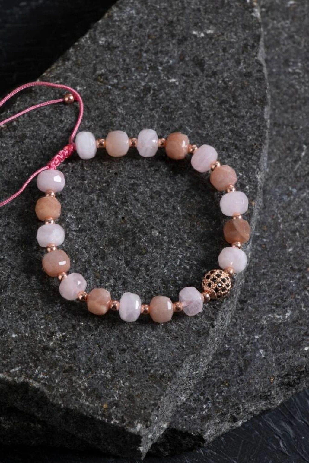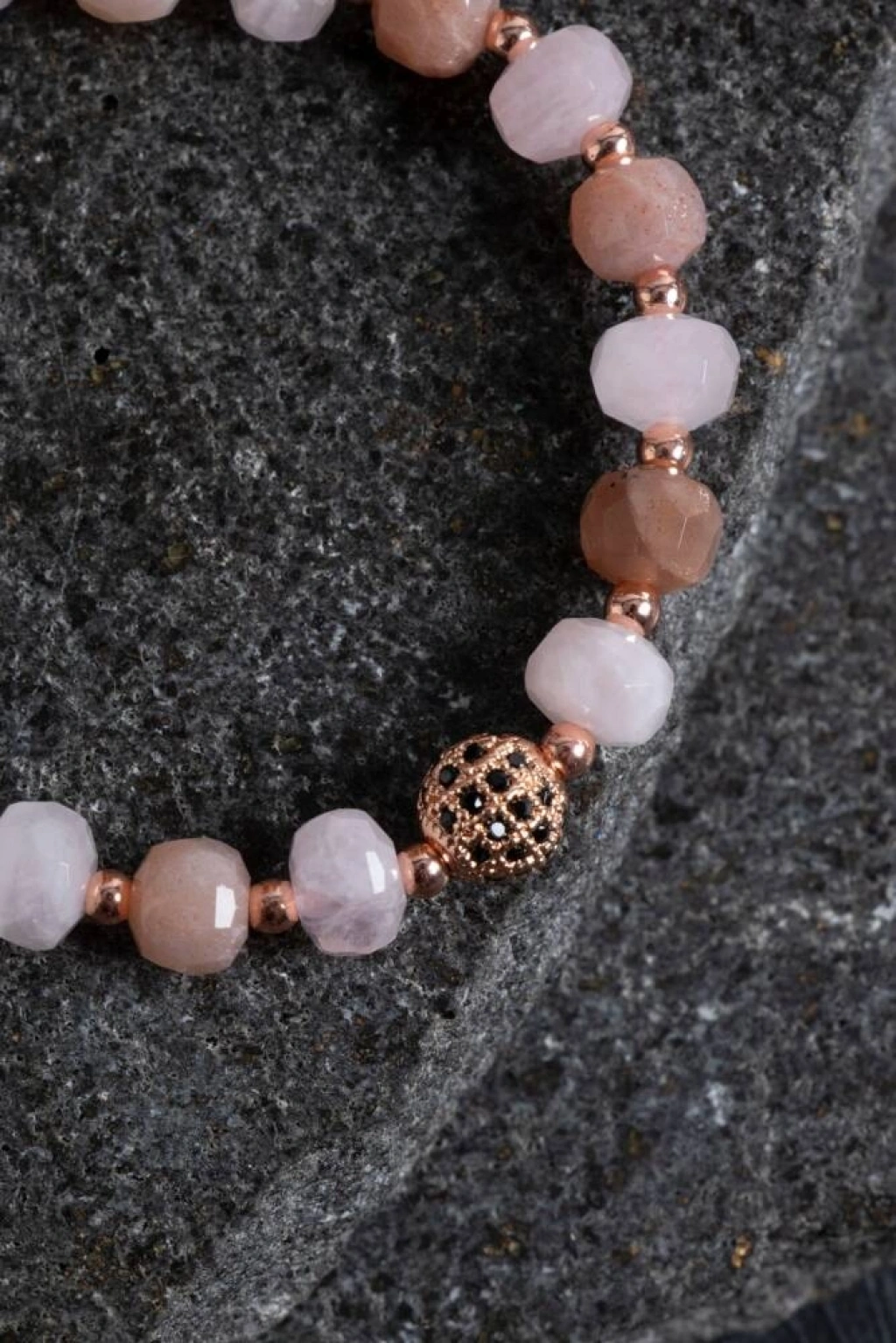 Bu zarif bileklik, sertifikalı güneş taşı ve pembe kuvarsın huzur veren birleşimiyle tasarlanmıştır. Güneş taşı neşe, canlılık ve özgüven enerjisi sunarken; pembe kuvars ise sevgi, şefkat ve duygusal dengeyi destekler. Pembe tonlardaki detaylarıyla hem feminen hem de enerjik bir duruş sergileyen bu model, günlük stilinize zarif bir dokunuş katar.
