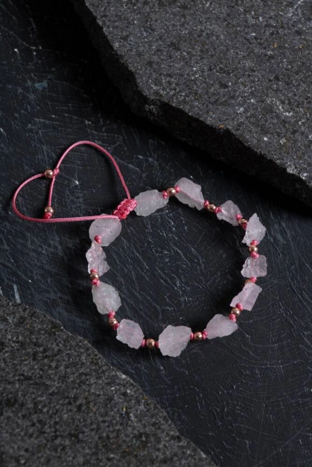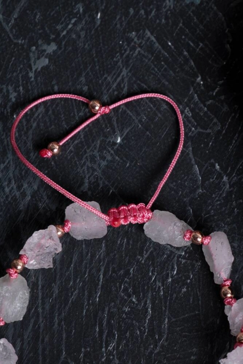 Doğal ve güçlü bir enerjiye sahip olan bu bileklik, sertifikalı ham pembe kuvars taşlarından hazırlanmıştır. Pembe kuvars, sevgi, şefkat ve duygusal iyileşmeyi destekleyen kalp çakrası taşı olarak bilinir. Ham taşların doğal dokusu ve pembe ip detaylarıyla, hem enerjisiyle hem de tasarımıyla fark yaratan özel bir aksesuardır.