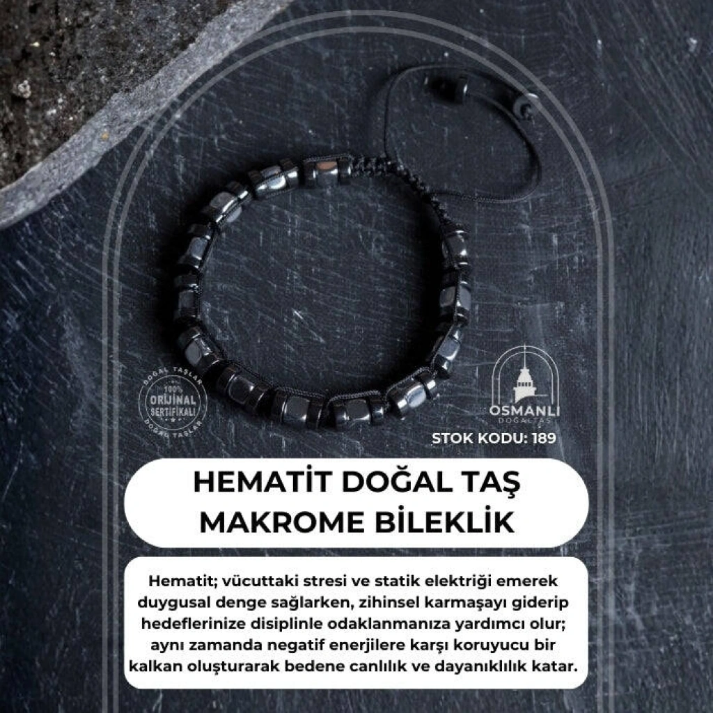 Hematit Doğal Taş Makrome Bileklik Dengenizi bulun, enerjinizi koruyun, gücünüzü sergileyin! Doğanın en maskülen ve koruyucu taşlarından biri olan Hematit, titizlikle örülen makrome detaylarla bu özel bileklikte buluştu. Hem spor hem de klasik tarzınıza kusursuzca eşlik edecek bu parça; zihninizi berraklaştırmak ve günün stresinden arınmak için ihtiyacınız olan enerji desteğini sunar. Hematit Taşının Sarsılmaz Gücü Topraklama ve Denge: En güçlü topraklama taşlarından biri olan Hematit, vücuttaki statik elektriği ve stresi emer. Sizi hayata bağlar ve duygusal olarak merkezde kalmanızı sağlar. Zihinsel Odaklanma: Karar verme süreçlerinde netlik sağlar. Zihinsel karmaşayı gidererek hedeflerinize daha kararlı ve disiplinli bir şekilde ilerlemenize yardımcı olur. Enerji Kalkanı: Negatif enerjilere karşı bir koruyucu bariyer görevi görür. Kendinizi hem ruhsal hem de fiziksel olarak daha dayanıklı hissetmenizi destekler. Kan Dolaşımı ve Canlılık: Geleneksel olarak kan dolaşımını düzenlediğine ve bedene enerji verdiğine inanılan kadim bir taştır. Tasarım ve Malzeme Özellikleri A Kalite Hematit Taşları: Ayna parlaklığında, kusursuz ve metalik yansımalarıyla dikkat çeken birinci sınıf doğal taşlar kullanılmıştır. Ayarlanabilir Makrome Kapama: El emeği sürgülü makrome yapısı sayesinde her bilek ölçüsüne tam uyum sağlar. Takıp çıkarması son derece pratiktir. Dayanıklı El İşçiliği: Suya ve günlük yoğun tempoya dayanıklı, kopma yapmayan yüksek kaliteli paraşüt ipleriyle elde örülmüştür. Minimalist ve Modern: Saf metalik füme rengi sayesinde tek başına veya diğer aksesuarlarınızla (özellikle saatlerle) mükemmel bir uyum yakalar. Neden Bu Bilekliği Seçmelisiniz? Zihinsel Detoks: Gün boyu maruz kalınan stresi ve radyasyonu vücuttan uzaklaştırmak için ideal bir enerji arkadaşıdır. Unisex Şıklık: Hem erkek hem de kadın kullanıcılar için uygun olan bu tasarım, 'sessiz lüks' ve gücün simgesidir. Anlamlı Bir Hediye: Sevdiklerinize denge, güç ve sarsılmaz bir sükunet dilemenin en sade ve etkileyici yolu.