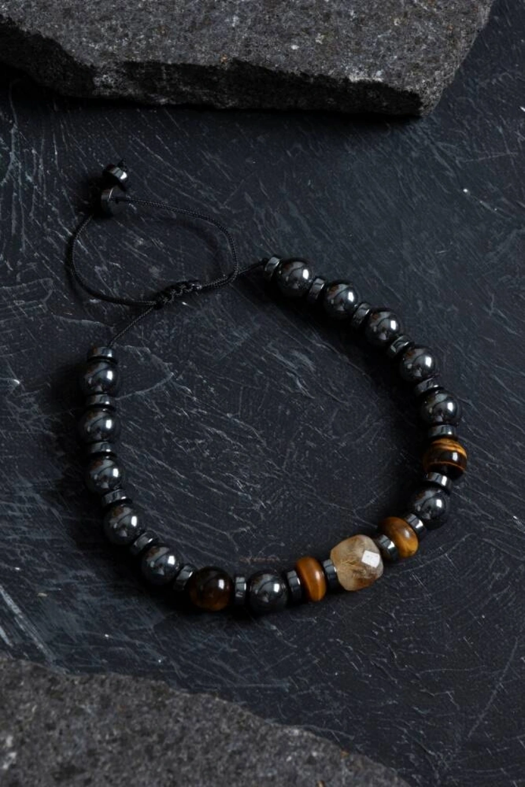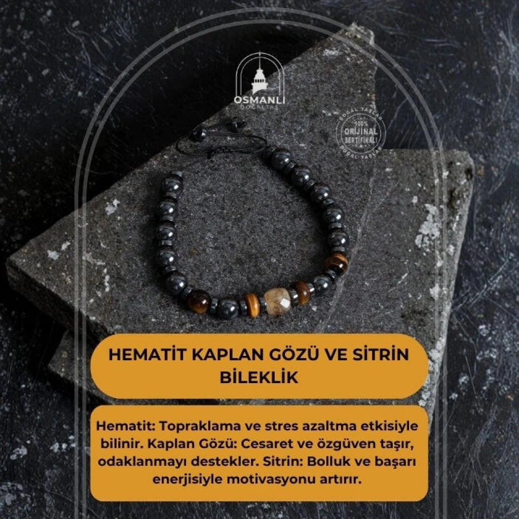 Güç, denge ve bolluk bir arada! Doğal hematit, kaplan gözü ve sitrin taşlarıyla hazırlanan bu bileklik; zihinsel netlik, cesaret ve bolluk enerjisi sunar. Hematit: Topraklama ve stres azaltma etkisiyle bilinir. Kaplan Gözü: Cesaret ve özgüven taşır, odaklanmayı destekler. Sitrin: Bolluk ve başarı enerjisiyle motivasyonu artırır. Ayarlanabilir ipli yapısıyla her bileğe uyum sağlar. Şık ve güçlü bir görünüm isteyenler için mükemmel bir seçim!