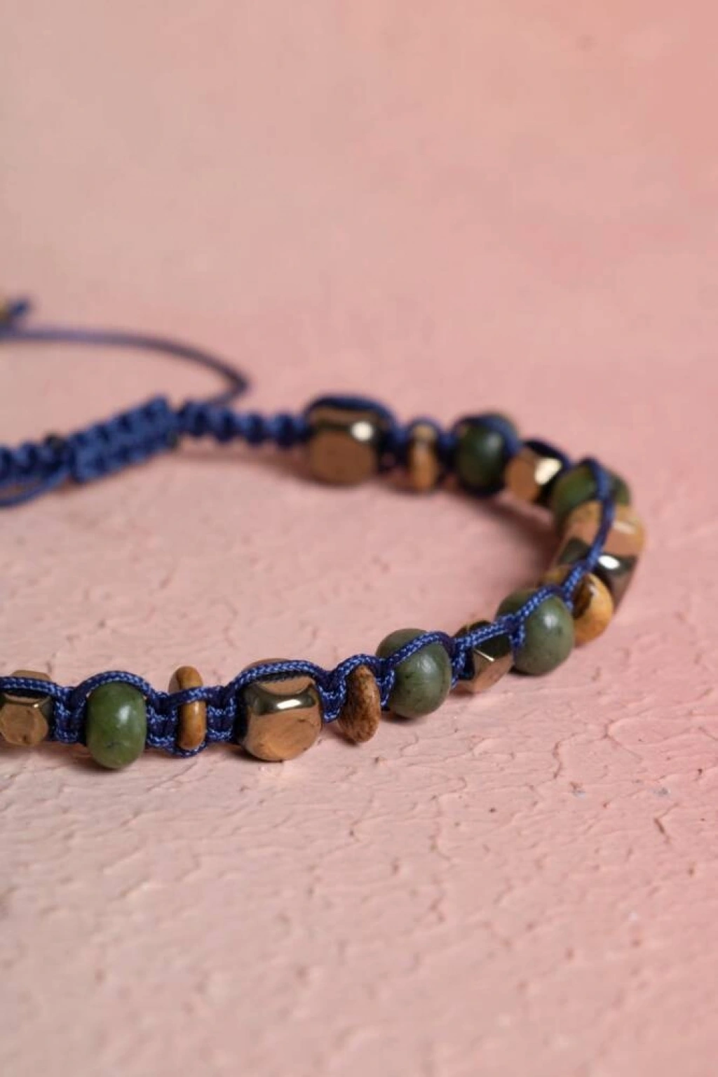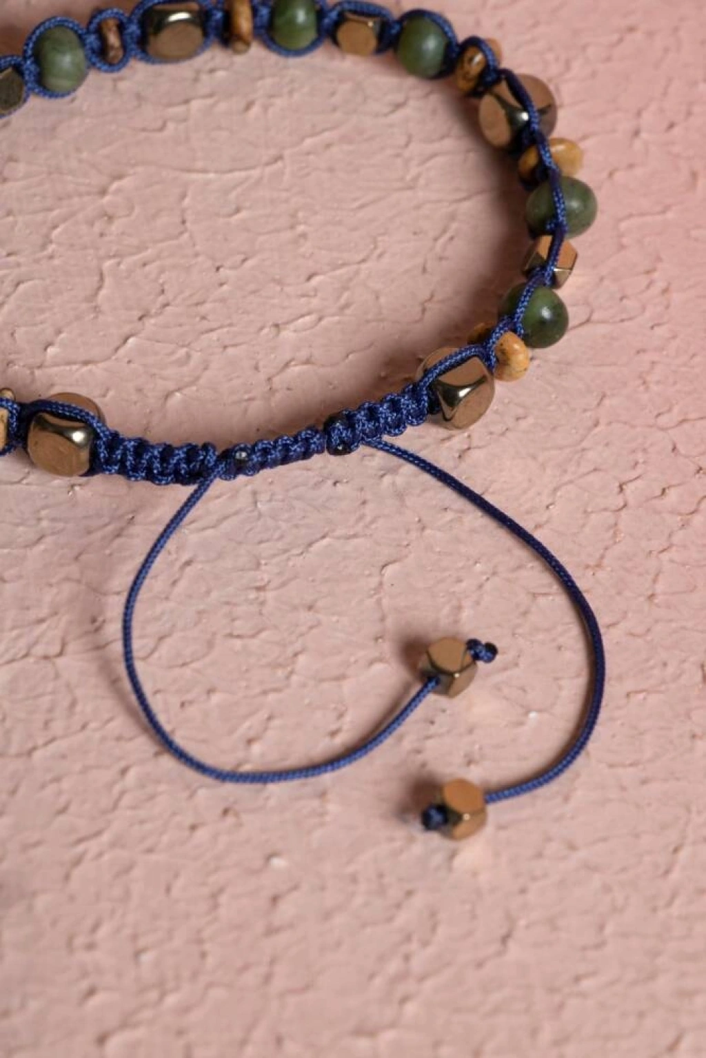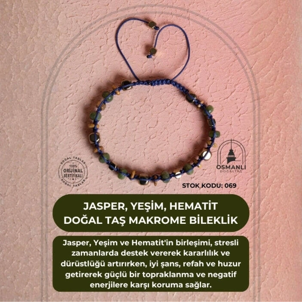 Jasper, Yeşim, Hematit Doğal Taş Makrome Bileklik Güç, denge ve şans enerjisini bileğinizde birleştirin. Jasper'ın sağlamlığı, Yeşim'in bereketi ve Hematit'in koruyuculuğu, dayanıklı Makrome Örgü ile birleşerek bu özel bilekliği oluşturuyor. Bu sadece bir aksesuar değil, aynı zamanda günlük hayatınızda sizi destekleyen ve koruyan güçlü bir enerji kaynağıdır. Üç Güçlü Taşın Mistik Sinerjisi Jasper (Besleyici ve Kararlılık): 'Yüce Besleyici' olarak bilinir. Stresli zamanlarda destekler, kararlılığı ve dürüstlüğü artırır. Yeşim (Bolluk ve Şans): Tarih boyunca bilgelik, iyi şans ve refah getirdiğine inanılan değerli bir taştır. Huzuru ve uyumu teşvik eder. Hematit (Topraklanma ve Koruma): En etkili topraklanma taşlarındandır. Enerjinizi köklendirir, dengeyi artırır ve negatif enerjiyi nötralize ederek güçlü bir koruma sağlar. Enerji Kombinasyonu: Bu üçlü, fiziksel sağlamlığı (Jasper/Hematit), maddi/manevi refahı (Yeşim) ve güçlü korumayı (Hematit) birleştirerek bütünsel bir denge sunar. Makrome Modelin Estetik ve Pratikliği Dayanıklı Makrome Tasarım: Sağlam ve ayarlanabilir Makrome örgü modeli, bilekliği her bilek ölçüsüne uyumlu ve günlük kullanıma son derece dayanıklı hale getirir. Doğal Uyum: Taşların toprak tonları (Jasper/Yeşim) ve metalik parlaklığı (Hematit), doğal ve estetik bir uyum yakalar.