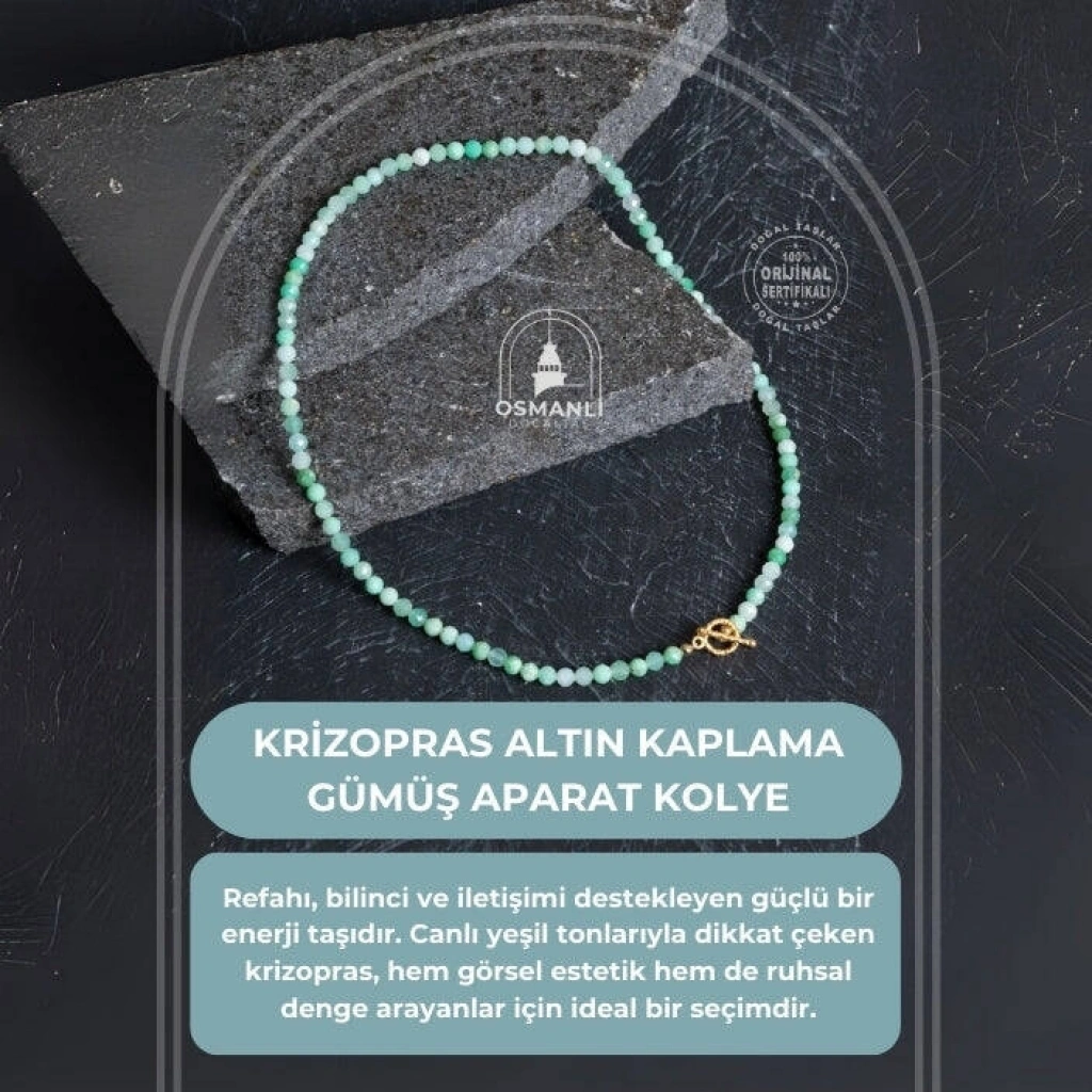 Doğanın içinden gelen huzur ve zarafetle tasarlanan bu özel Krizopras Taşı Kolye, sadece bir aksesuar değil; aynı zamanda refahı, bilinci ve iletişimi destekleyen güçlü bir enerji taşıdır. Canlı yeşil tonlarıyla dikkat çeken krizopras, hem görsel estetik hem de ruhsal denge arayanlar için ideal bir seçimdir. Krizopras Taşının Faydaları: Refah ve zenginlik enerjisi getirir: Bolluk bilinci kazandırır, finansal fırsatlara açıklık sağlar. Girişimcilik ruhunu destekler: İleri görüşlü, kararlı ve ihtiyatlı kararlar almanıza yardımcı olur. Akıcı ve etkileyici konuşma becerisi sağlar: Topluluk önünde konuşma, kendini ifade etme ve ikna kabiliyetini artırır. Hem günlük kullanıma uygun sade şıklığıyla hem de taşıdığı anlamla dikkat çeken bu kolye, özgün ve derinlikli bir tarz arayanlara hitap eder. Krizopras taşı, kişisel gelişimini önemseyen, hedeflerine bilinçle ilerlemek isteyen herkes için özel bir destek taşıdır. Kendiniz için anlamlı bir enerji takısı ya da sevdiklerinize fark yaratan bir hediye arıyorsanız, Krizopras Taşı Kolye harika bir seçim olacaktır.