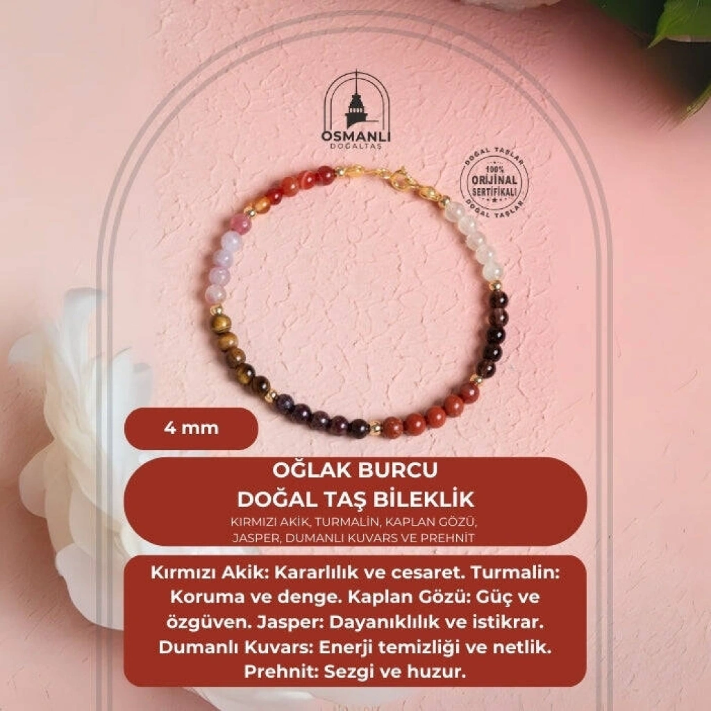 Güç, kararlılık ve içsel denge… Oğlak burcunun disiplinli ve sağlam enerjisini bileğinizde taşıyın. Bu özel kadın bilekliği, Oğlak burcunun çalışkan, hedef odaklı, güven veren ve sabırlı doğasına hitap eden doğal taşlarla tasarlandı: Kırmızı Akik – Kararlılık, cesaret ve yaşam enerjisini güçlendirir. Turmalin – Negatif enerjiyi arındırır, koruma ve denge sağlar. Kaplan Gözü – Güç, özgüven ve motivasyon enerjisi verir. Jasper – Dayanıklılık, istikrar ve topraklanma hissi kazandırır. Dumanlı Kuvars – Negatif enerjileri temizler, zihinsel netlik sunar. Prehnit – Sezgileri güçlendirir, içsel huzur ve ruhsal uyum sağlar. Bu altı taşın uyumu, Oğlak burcunun güçlü iradesini, kararlılığını ve yaşamındaki denge arayışını zarif bir şekilde yansıtır. %100 doğal ve sertifikalı taşlarla hazırlanmış bu bileklik, kadınlara özel zarif tasarımıyla hem ruhsal destek sunar hem de günlük stilinize şıklık katar. ✨ Öne Çıkan Özellikler: Sertifikalı Kırmızı Akik, Turmalin, Kaplan Gözü, Jasper, Dumanlı Kuvars ve Prehnit taşları Oğlak burcuna özel enerji: kararlılık, koruma, güç, huzur ve istikrar Doğal taşlar ile feminen ve güçlü görünüm Kadınlara özel sade ama zarif tasarım Günlük kullanımda hem enerjisel denge hem estetik stil Bu bileklik; sadece bir aksesuar değil, aynı zamanda Oğlak burcunun disiplinli, güven veren ve güçlü doğasını taşıyan özel bir parçadır.