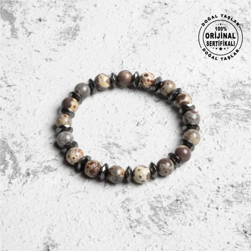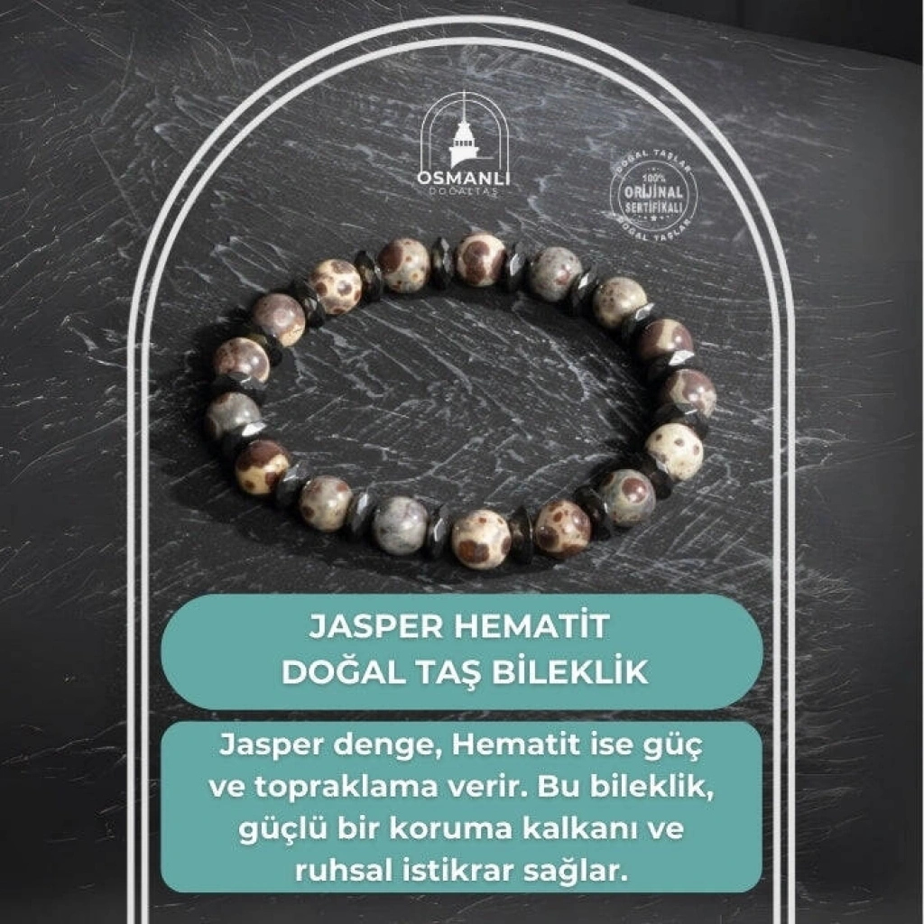 Osmanlı Doğal Taş markasının zarafetiyle üretilmiş, tamamen doğal jasper ve hematit taşlarından oluşan bu bileklik, ruhsal denge ve stil arayanlar için özel olarak tasarlanmıştır. Bilekliğimizin her taşı 10 mm boyutundadır ve geniş kesimi sayesinde bileğinizde zarif bir görünüm sunar. 16-21 cm arası beden seçenekleri mevcuttur; bileğinizi ölçerek size en uygun bedeni sipariş edebilirsiniz. Her bileklik, orijinalliğini garanti altına alan sertifikası ile gönderilir, böylece kalite ve güven sunar. Jasper ve Hematit Taşlarının Faydaları: Jasper Taşı: Jasper, stresle başa çıkmada destek olur ve enerjiyi dengeleyerek zihinsel huzur sağlar. Ayrıca, fiziksel dayanıklılığı artırdığına inanılır. Hematit Taşı: Hematit, topraklama özelliği ile bilinir ve negatif enerjiyi uzaklaştırarak ruhsal denge sağlar. Aynı zamanda, odaklanmayı ve zihinsel netliği destekler. Bu özel tasarıma sahip jasper ve hematit bileklik, günlük yaşantınıza hem enerji hem de estetik katmak için idealdir. Osmanlı Doğal Taş kalitesi ile üretilen bu bilekliği, hem ruhsal dengeyi korumak hem de zarif bir aksesuar olarak tercih edebilirsiniz. Sertifikalı bilekliğinizle enerjinizi dengeleyin ve stilinizi öne çıkarın!