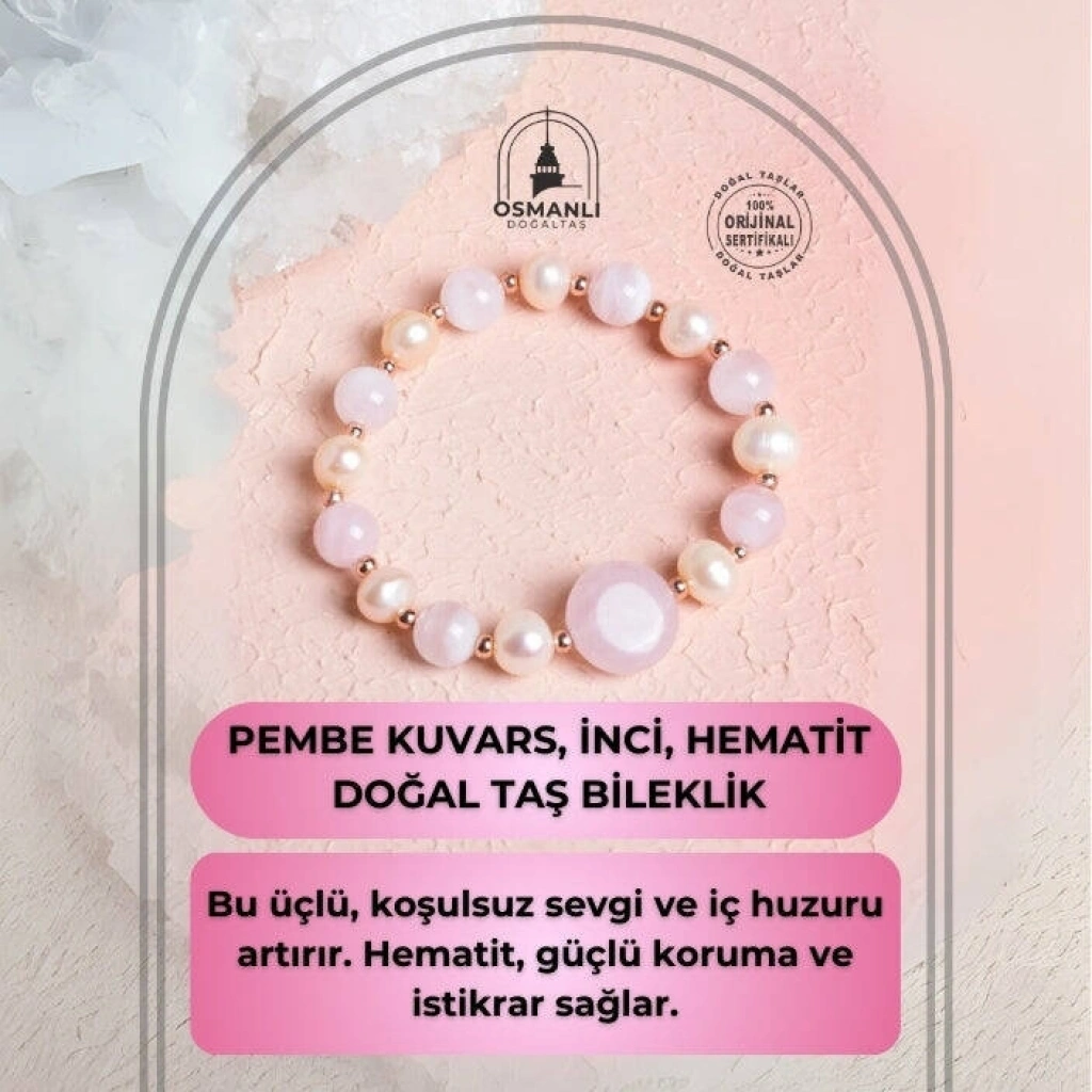 Sevgi, zarafet ve denge bileğinizde buluşuyor. Pembe Kuvars, kalp şifasını destekler, sevgi enerjisini yükseltir ve duygusal iyileşmeye katkı sağlar. İnci, zarafetin ve içsel dinginliğin sembolüdür; duyguları yumuşatır, duruluğu temsil eder. Hematit ise zihinsel netlik, odaklanma ve güçlü bir topraklanma etkisi sunarak tüm enerjileri dengeye getirir. Bu özel bileklik, %100 doğal ve sertifikalı taşlarla hazırlanmış olup, sade ve şık tasarımı sayesinde hem günlük hem enerjisel kullanım için idealdir. El işçiliğiyle üretilen bu zarif parça, duygusal ve zihinsel denge arayanlar için estetik bir şifa aracıdır. ✨ Öne Çıkan Özellikler: Sertifikalı Pembe Kuvars, İnci ve Hematit taşları Sevgi, duygusal şifa, zarafet ve zihinsel denge etkileri El yapımı, sade ve zamansız tasarım Unisex kullanım için uygun Günlük şıklıkla birlikte enerjisel destek sağlar Bu bileklik; yalnızca bir takı değil, aynı zamanda ruhunuza yumuşaklık, zihninize netlik ve kalbinize huzur taşıyan doğal bir uyum bütünüdür.