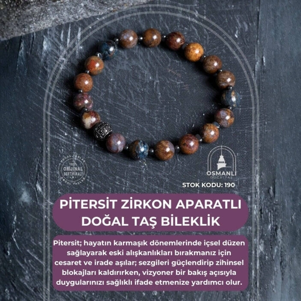 Pitersit Zirkon Aparatlı Doğal Taş Bileklik (Misinalı) Ruhunuzdaki fırtınayı güce, tarzınızı eşsiz bir şıklığa dönüştürün! Nadir bulunması ve büyüleyici desenleriyle koleksiyonerlerin gözdesi olan Pitersit, parıltılı Zirkon detaylarla bu özel tasarımda hayat buldu. 'Fırtına Taşı' olarak bilinen Pitersit’in içindeki altın, kahve ve mavi hareler; zirkonun zarafetiyle birleşerek size hem spiritüel bir derinlik hem de göz alıcı bir lüks sunuyor. Pitersit ve Zirkon’un Eşsiz Enerjisi Değişim ve Dönüşüm (Pitersit): Hayatınızdaki kaosu düzene sokmanıza yardımcı olur. Eski kalıplardan kurtulup yeni başlangıçlar yapma cesareti verir. 'Fırtına Taşı' denmesinin sebebi, hayatın fırtınalı dönemlerinde sakin kalmanızı ve gerçeği görmenizi sağlamasıdır. Sezgi ve Farkındalık: Üçüncü göz ve solar pleksus çakralarını birbirine bağlar. İrade gücünü artırırken, sezgilerinizi keskinleştirir ve vizyoner bir bakış açısı kazandırır. özgün Enerji: Zihinsel blokajları kaldırır, hayal gücünü tetikler ve bastırılmış duyguların sağlıklı bir şekilde dışa vurulmasına yardımcı olur. Zirkon Işıltısı: Tasarımı bir mücevher asaletine taşıyan zirkon aparatlar, Pitersit'in mistik harelerini parlatır ve auranıza pozitif bir ışık katar. Tasarım ve Malzeme Özellikleri Nadir ve A Kalite Taşlar: Her biri adeta birer tabloyu andıran, yüksek kaliteli ve karakteristik dokusu belirgin orijinal Pitersit taşları kullanılmıştır. Lüks Zirkon Aparatlar: Kararmaya karşı dayanıklı özel kaplamalı ve yüksek ışıltılı zirkon taşlı detaylar ile tasarım zenginleştirilmiştir. Eşsiz Desenler: Doğal yapısı gereği her Pitersit taşı benzersizdir; bu bileklik dünyada sadece size özel bir sanat eseri niteliği taşır. Pratik Misinalı Tasarım: Yüksek kaliteli, kopmaya dayanıklı esnek misinası sayesinde kolayca takılıp çıkarılabilir ve her bilek ölçüsüne uyum sağlar. Neden Bu Bilekliği Seçmelisiniz? Nadir ve Değerli: Standart doğal taşların ötesinde, az bulunan ve değeri her geçen gün artan bir taşa sahip olma ayrıcalığını yaşatır. Ruhsal Rehberlik: Hayat yolculuğunda yönünü bulmak, kararlılık kazanmak ve içsel gücünü keşfetmek isteyenler için en etkili taşlardan biridir. Prestijli Bir Hediye: Özel olduğunu hissettirmek istediğiniz birine veya kendinize verebileceğiniz en sofistike ve anlamlı hediyelerden biri.