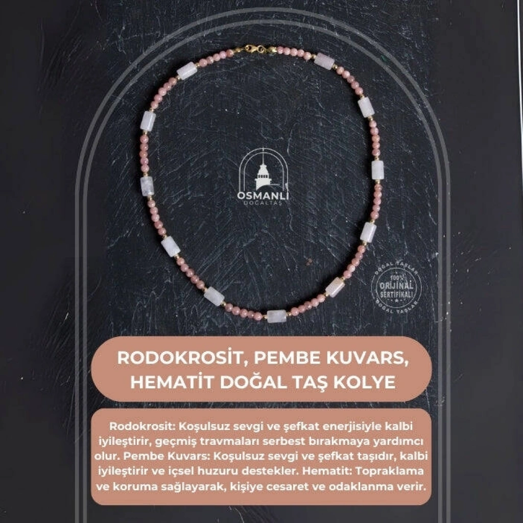 Rodokrozit Taşı Özellikleri: Olaylara pozitif yaklaşmayı sağlar. Migreni hafifletir. Hayatta yenilikleri teşvik eder ve destekler. Özsaygı ve değeri artırır. Pembe Kuvars: Sevgi taşı olarak bilinen pembe kuvars, duygusal dengeyi ve huzuru destekler. Ruhsal iyileşmeyi teşvik eder ve çevrenize sevgi enerjisi yaymanıza yardımcı olur. Hematit: Negatif enerjileri uzaklaştırarak topraklama sağlar ve zihinsel netliği artırır. Dengeleyici özellikleri sayesinde odaklanmayı kolaylaştırır.