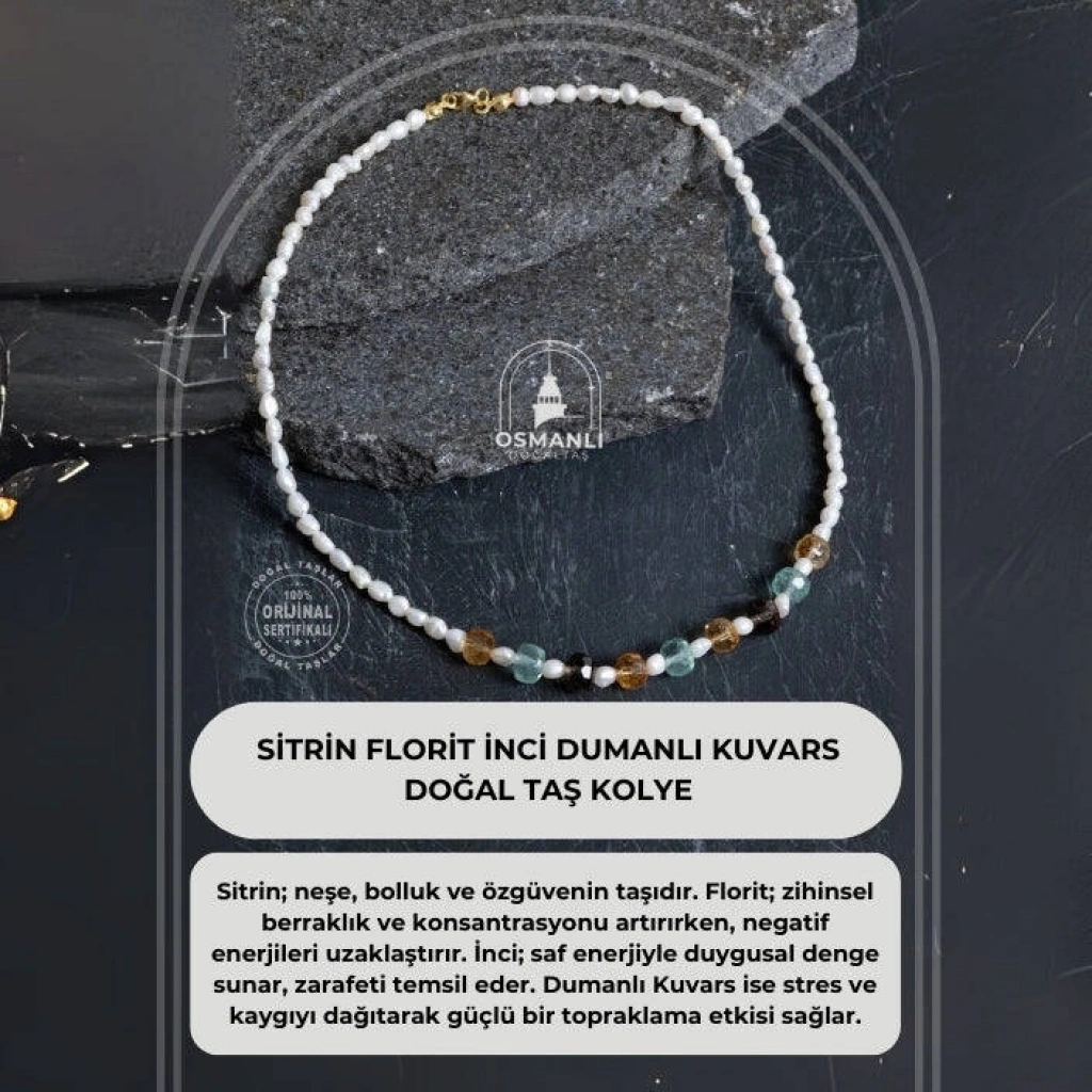 Zarafet, denge ve yüksek frekanslı enerji bu kolyede buluşuyor. Sitrin; neşe, bolluk ve özgüvenin taşıdır. Florit; zihinsel berraklık ve konsantrasyonu artırırken, negatif enerjileri uzaklaştırır. İnci; saf enerjiyle duygusal denge sunar, zarafeti temsil eder. Dumanlı Kuvars ise stres ve kaygıyı dağıtarak güçlü bir topraklama etkisi sağlar. Bu özel kolye, tamamı doğal ve sertifikalı taşlardan özenle hazırlanmıştır. Taşların doğal renk geçişleri ve birbirini dengeleyen frekansları, hem ruhsal hem estetik bir bütünlük oluşturur. El işçiliğiyle tasarlanan bu parça, şıklığı ve enerjiyi bir araya getirir. ✨ Öne Çıkan Özellikler: Sertifikalı doğal Sitrin, Florit, İnci ve Dumanlı Kuvars taşları Pozitif enerji, duygusal denge, zihinsel netlik ve topraklama etkisi El yapımı, zarif ve özgün tasarım Unisex kullanım – hem günlük stilinize hem özel anlarınıza uyumlu Enerjisi kadar anlamı da güçlü bir hediye seçeneği Bu kolye; ışığı, şifayı ve zarafeti bir araya getiren çok taşlı bir enerji bileşenidir. Ruhunuza iyi gelir, stilinize derinlik katar.