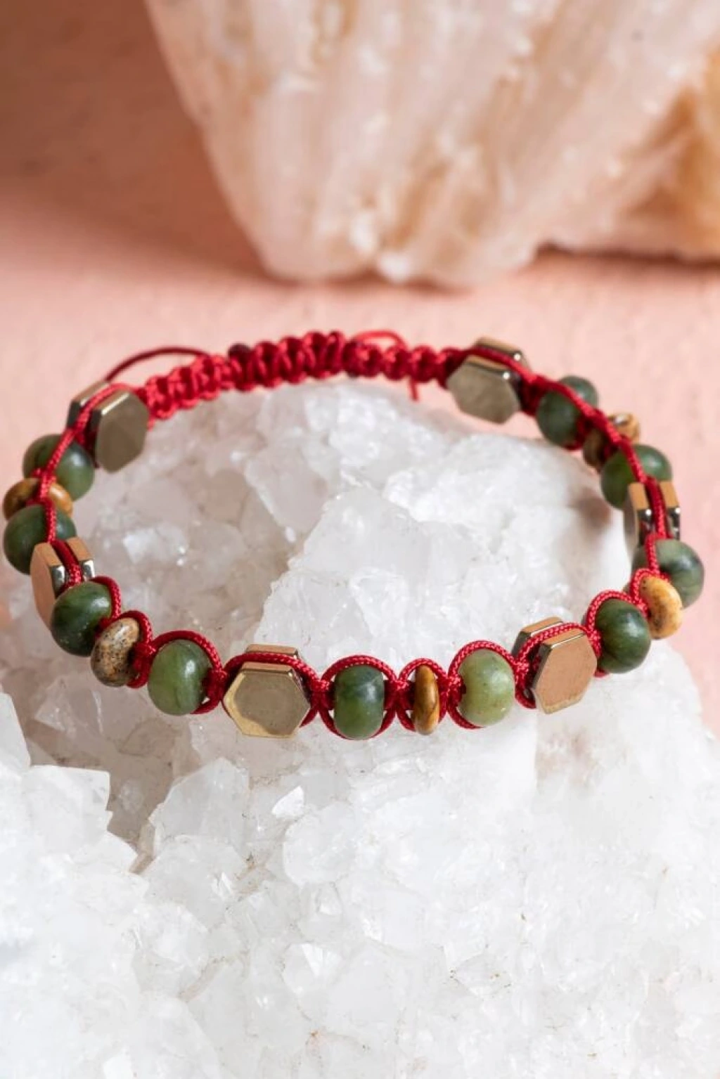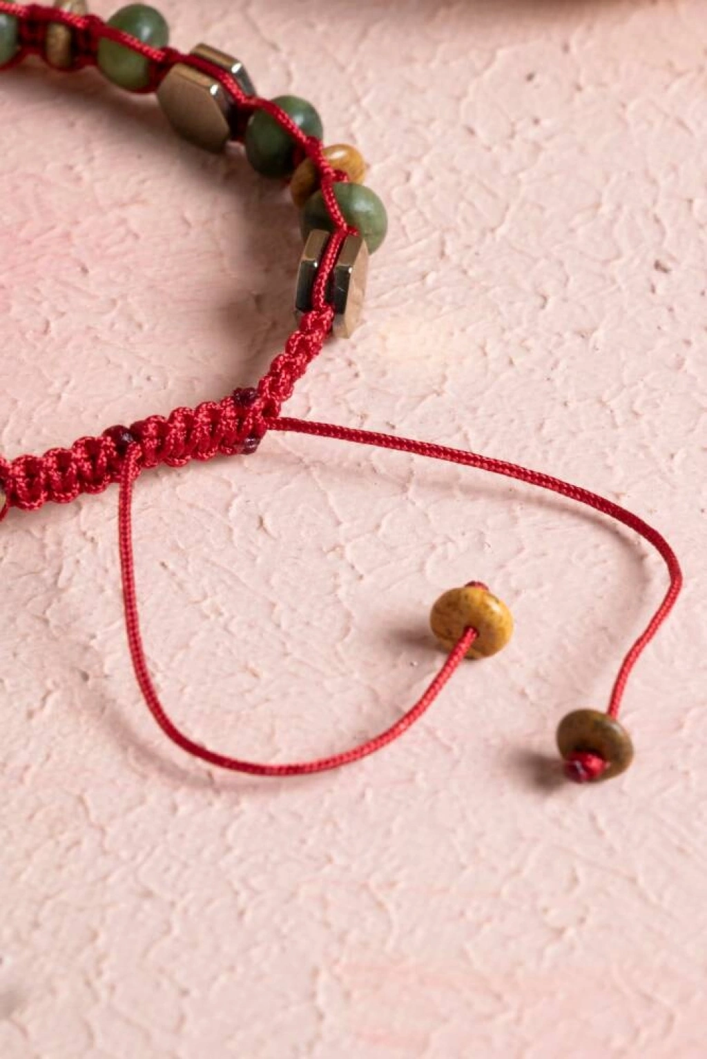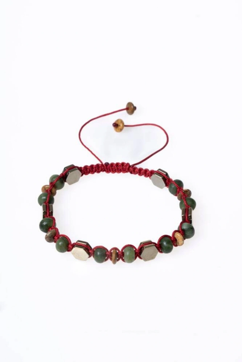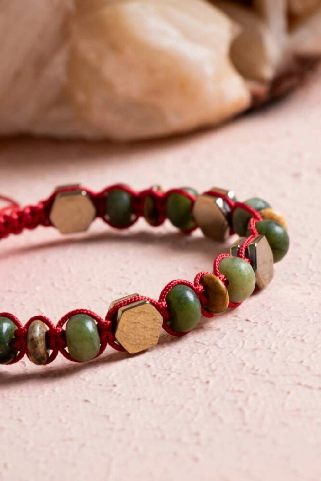 Yeşim, Jasper, Hematit Doğal Taş Makrome Bileklik Refahı, kararlılığı ve güçlü korumayı bileğinizde birleştirin. Yeşim'in şansı, Jasper'ın topraklayıcı gücü ve Hematit'in koruyuculuğu, dayanıklı Makrome Örgü ile birleşerek bu özel bilekliği oluşturuyor. Bu sadece bir aksesuar değil, aynı zamanda günlük hayatınızda sizi destekleyen ve dengeleyen güçlü bir enerji kaynağıdır. Üç Güçlü Taşın Mistik Sinerjisi Yeşim (Bolluk ve Şans): Tarih boyunca bilgelik, iyi şans, huzur ve refah getirdiğine inanılan değerli bir taştır. Kalp çakrasını destekler. Jasper (Topraklanma ve Kararlılık): 'Yüce Besleyici' olarak bilinir. Stresli zamanlarda destekler, kararlılığı, enerjiyi ve dürüstlüğü artırır. Hematit (Koruma ve Denge): En etkili topraklanma taşlarındandır. Enerjinizi köklendirir, dengeyi artırır ve negatif enerjiyi nötralize ederek güçlü bir koruma sağlar. Enerji Kombinasyonu: Bu üçlü, maddi/manevi refahı (Yeşim), fiziksel ve zihinsel sağlamlığı (Jasper) ve güçlü korumayı (Hematit) birleştirerek bütünsel bir destek sunar. Makrome Modelin Estetik ve Pratikliği Dayanıklı Makrome Tasarım: Sağlam ve ayarlanabilir Makrome örgü modeli, bilekliği her bilek ölçüsüne uyumlu ve günlük kullanıma son derece dayanıklı hale getirir. Doğal Uyum: Taşların toprak yeşili ve metalik gri tonları (Yeşim/Jasper/Hematit), doğal ve estetik bir uyum yakalar.