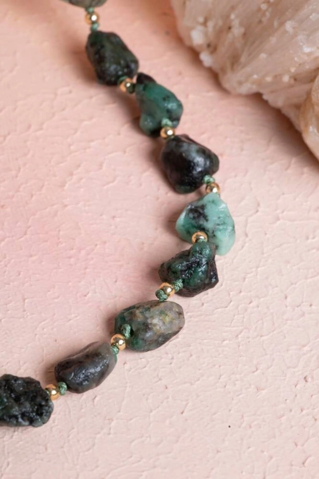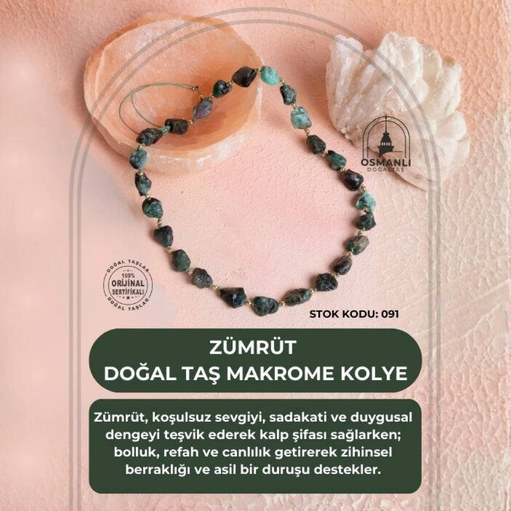 Zümrüt Doğal Taş Makrome Kolye Koşulsuz sevginin, bolluğun ve yaşam gücünün taşı Zümrüt'ün asil enerjisini kalbinize yakın taşıyın. Nadir bulunan ve değerli Zümrüt doğal taşının canlı yeşil ışıltısı, dayanıklı Makrome Örgü ile birleşerek bu özel kolyeyi oluşturuyor. Bu kolye, size duygusal şifa, refah ve içsel uyum sağlayan güçlü bir enerji kaynağıdır. Zümrüt Taşının Büyüleyici Faydaları ve Zarafeti Koşulsuz Sevgi ve Kalp Şifası: Zümrüt, kalp çakrasının en güçlü taşlarından biridir. Koşulsuz sevgiyi, sadakati ve duygusal dengeyi teşvik eder. Kalpteki yaraları iyileştirmeye yardımcı olur. Bolluk ve Refah: Tarih boyunca şans, bolluk ve refah getirdiğine inanılmıştır. Yeni başlangıçlara ve başarıya giden yolda size destek olur. Canlılık ve Bilgelik: Yaşam enerjisini artırır, zihinsel berraklığı ve içsel bilgeliği destekler. Asil Duruş: Zümrüt'ün derin ve canlı yeşil rengi, Makrome örgünün doğal dokusuyla birleşerek boynunuzda asil ve göz alıcı bir zarafet yaratır. Makrome Modelin Estetik ve Pratikliği Dayanıklı Makrome Tasarım: Sağlam ve ayarlanabilir Makrome örgü modeli, kolyenin uzunluğunu kişiselleştirme imkanı sunar ve günlük kullanıma son derece dayanıklıdır. Doğal Uyum: Zümrüt'ün doğal formu ve yeşil tonları, boynunuzda hem mistik hem de estetik bir ifade yaratır.