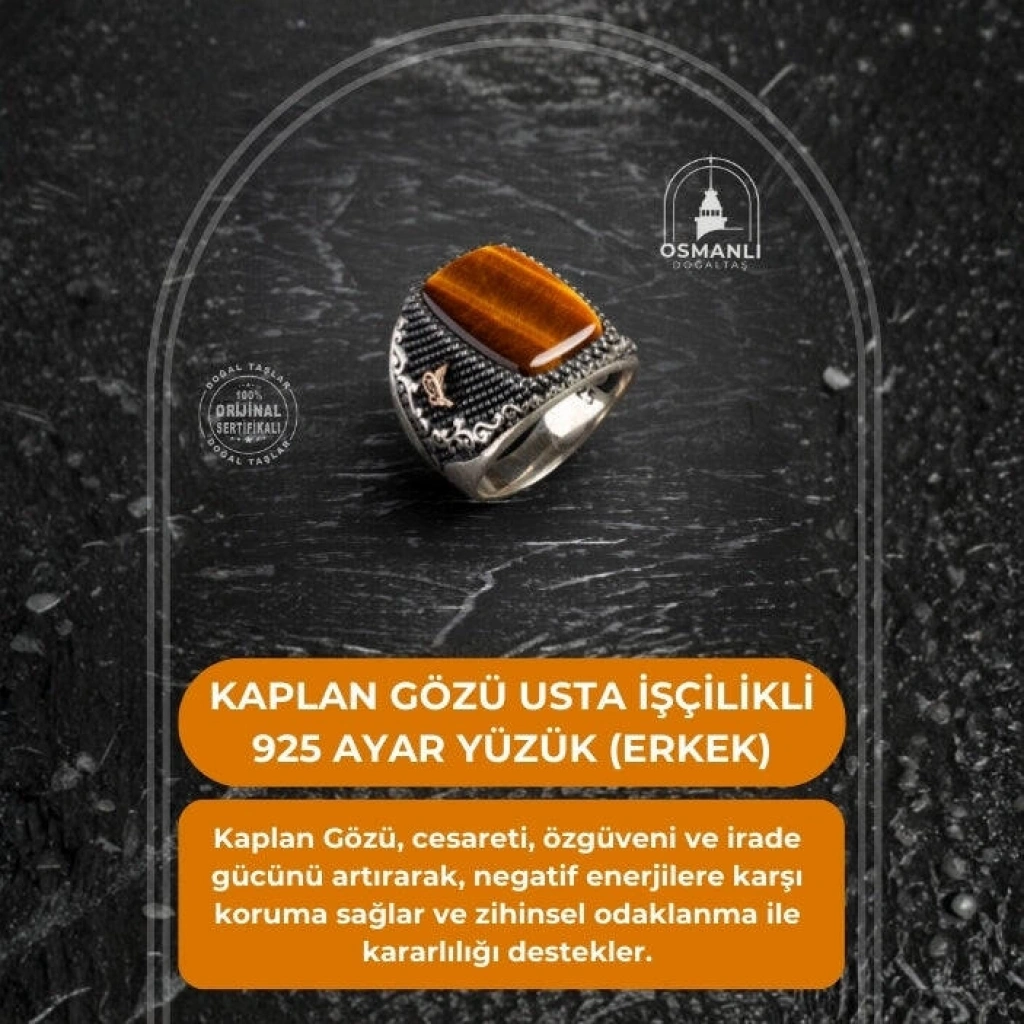 Güç, cesaret ve karizmayı bir araya getiren Usta İşçilikli 925 Ayar Gümüş Kaplan Gözü Yüzük (Erkek) , doğanın eşsiz taşlarından biri olan Kaplan Gözü ile tasarlanmıştır. Derin altın kahve tonları ve ışığa göre değişen büyüleyici parlaklığıyla dikkat çeken bu özel yüzük, güçlü ve özgüvenli bir duruş sergilemek isteyenler için idealdir. Kaplan Gözü Taşının Özellikleri ve Faydaları: Cesaret ve Özgüven: Kararsızlığı giderir, cesareti, özgüveni ve irade gücünü artırır. Odaklanma ve Netlik: Zihinsel berraklığı destekler ve hedeflere odaklanmayı kolaylaştırır. Koruma ve Şans: Negatif enerjilere ve nazara karşı güçlü bir kalkan oluşturur. Denge: İçsel huzuru destekler, stresi ve endişeyi hafifletir. Fiziksel Etkiler: Baş ağrısını hafifletmeye yardımcı olduğu ve enerji akışını dengelediği bilinir.