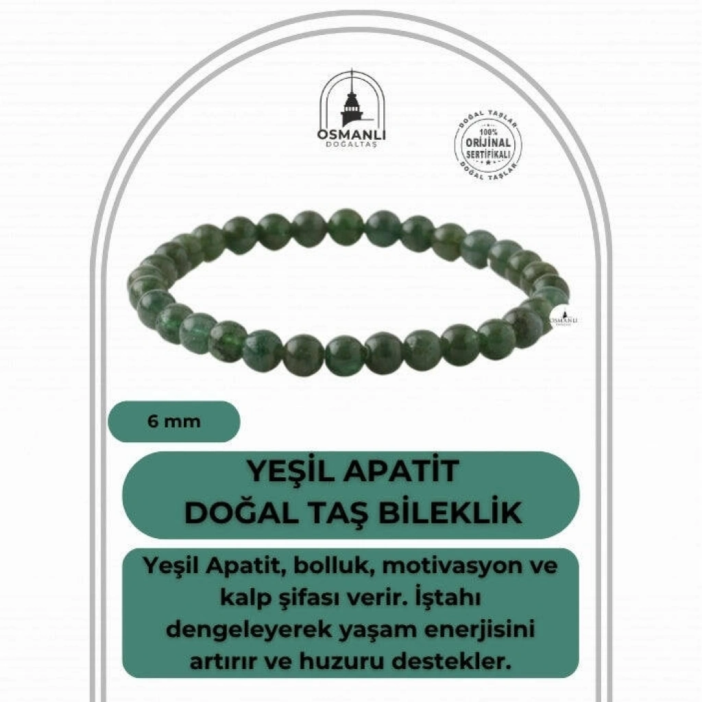TÜM TAŞLARIMIZ SERTİFİKALI ve %100 ORJİNAL GERÇEK DOĞAL TAŞTIR. Doğal taş takılarının bu eşsiz güzelliği ve faydalarıyla müşterilerimize en kaliteli ve en özel takıları sunuyoruz. Her bir takı, tasarımcılarımız tarafından özenle hazırlanmış, doğal taşların renkleri ve enerjileri ile birlikte, size en uygun olanı seçmenizi sağlar. Doğal taş takılarımız, herhangi bir moda stiline mükemmel bir şekilde uyum sağlar. Aynı zamanda doğanın eşsiz güzelliklerini keşfetmek isteyenler için de harika bir seçenek sunarlar. Kendinizi özel hissetmek istediğinizde, doğal taş takılarımız sizin için mükemmel bir seçenek olacaktır. Ürün İçeriğindeki Taşlar Aşağıda Listelenmiştir. Yeşil Apatit Taşı Özellikleri: Açlık hissini bastırarak kilo vermeyi destekler ve artırır, Zihin açıklığı verir, öğrenmeyi ve idrak etmeyi yükseltir. BİLGİ: Doğal taşların faydaları günümüzde birçok kullanıcıdan alınan geri dönüşlerde defeatle gözlemlenmiştir. Kan dolaşımına ve sindirim sistemine bir ilaç gibi dahil edilememesi; enerjileri ve kullanımı açısından sunacağı faydaya inanma ön koşulu gerektirmesiyle kesinlikle bir ilaç mahiyetinde değildir. Fakat geçmişten günümüze Biruni ve İbn-i Sina gibi büyük tıp alimleri doğal taşlar üzerinde düşünmüş, araştırmış ve geliştirdikleri tedavi yöntemlerine dahil etmişlerdir.Doğal taşların faydaları bilimsel bir deney-gözlem sürecinden ziyade geçmişte yaşayan toplumların ve tıp alimlerinin kullanım amaçlarına istinaden belirlenmekte, tespit edilmektedir. Bil biliyoruz ki şifa sadece Allah’tandır. Nereden ve nasıl geleceği belli olmaz. KAYNAK: Osmanlı Doğaltaş taşların özellikleri ve kullanım bilgileri için aşağıdaki kaynaklardan faydalanmaktadır.Walter Schumann, Gemstones Of The World (Sterling Yayın Evi, 17. Baskı).Judy Hall, Değerli Taşlar Kitabı (Alfa Basım Yayın, 3. Basım, 2021)Muhammed Bin Mahmud-ı Şirvani, Tuhfe-i Muradi. Hazırlayan: Mustafa Argunşah (Türk Dil Kurumu, 1999)Patrick Voillot, Elmaslar ve Değerli Taşlar (Yapı Kredi Yayınları, 1. Baskı, 2013)